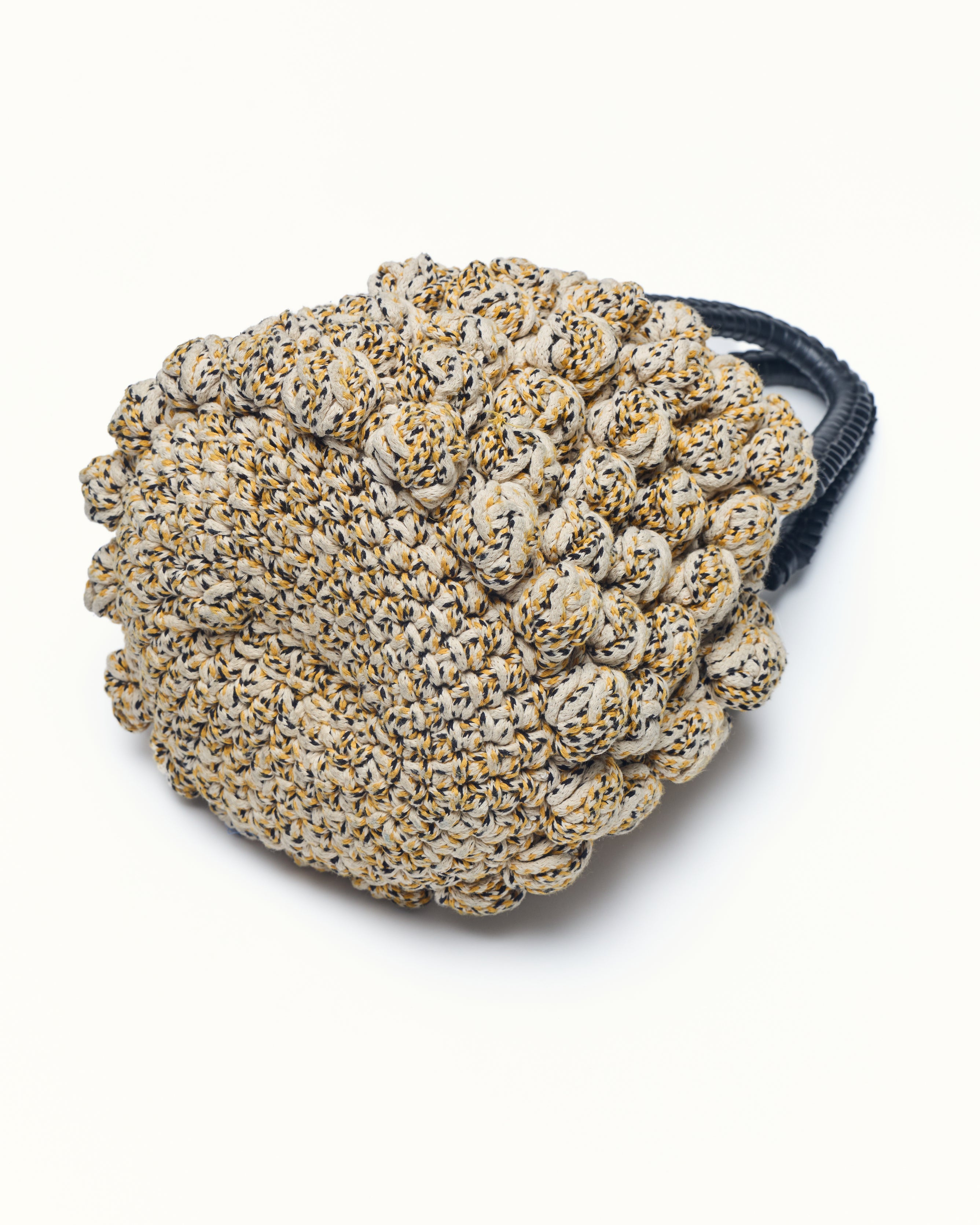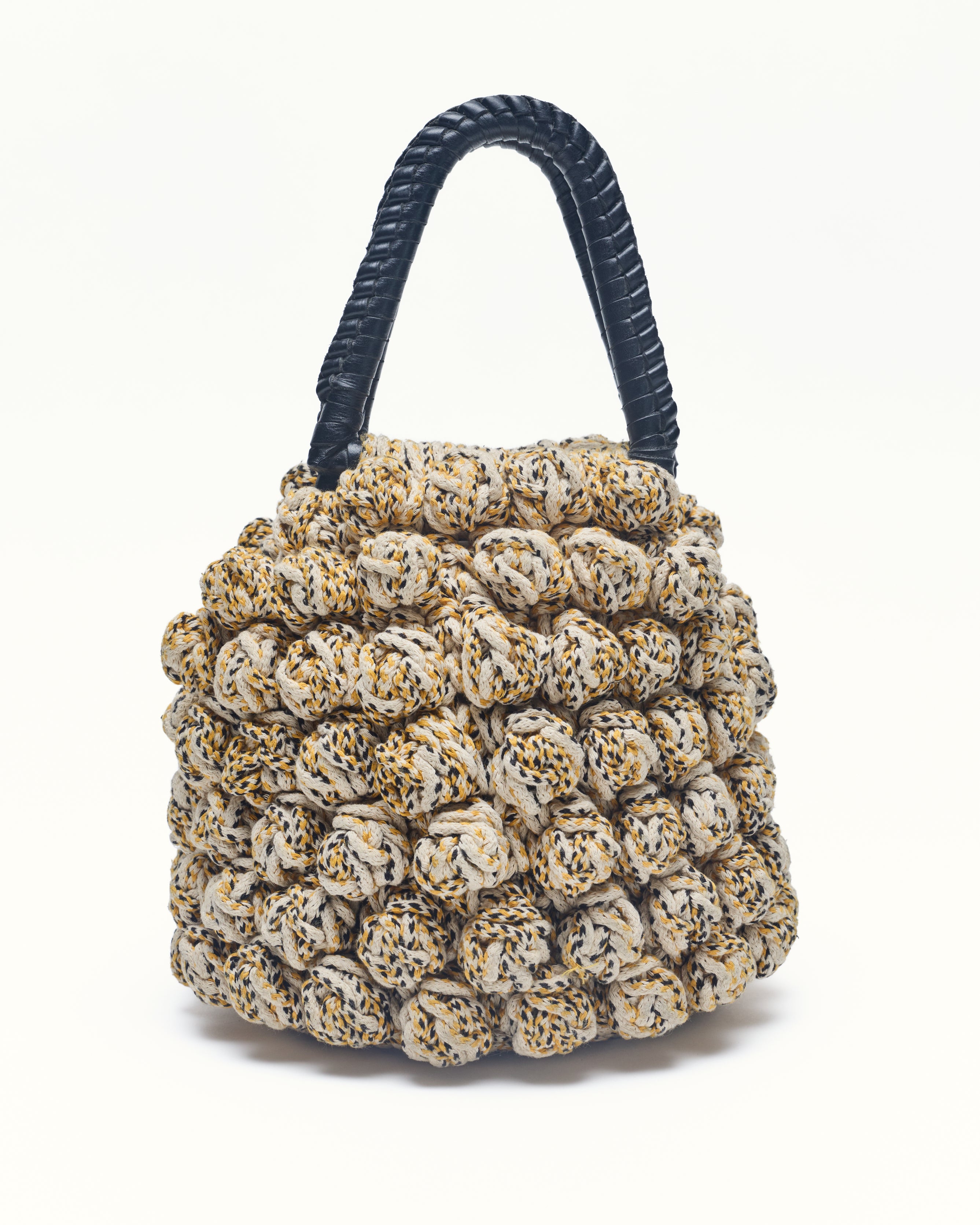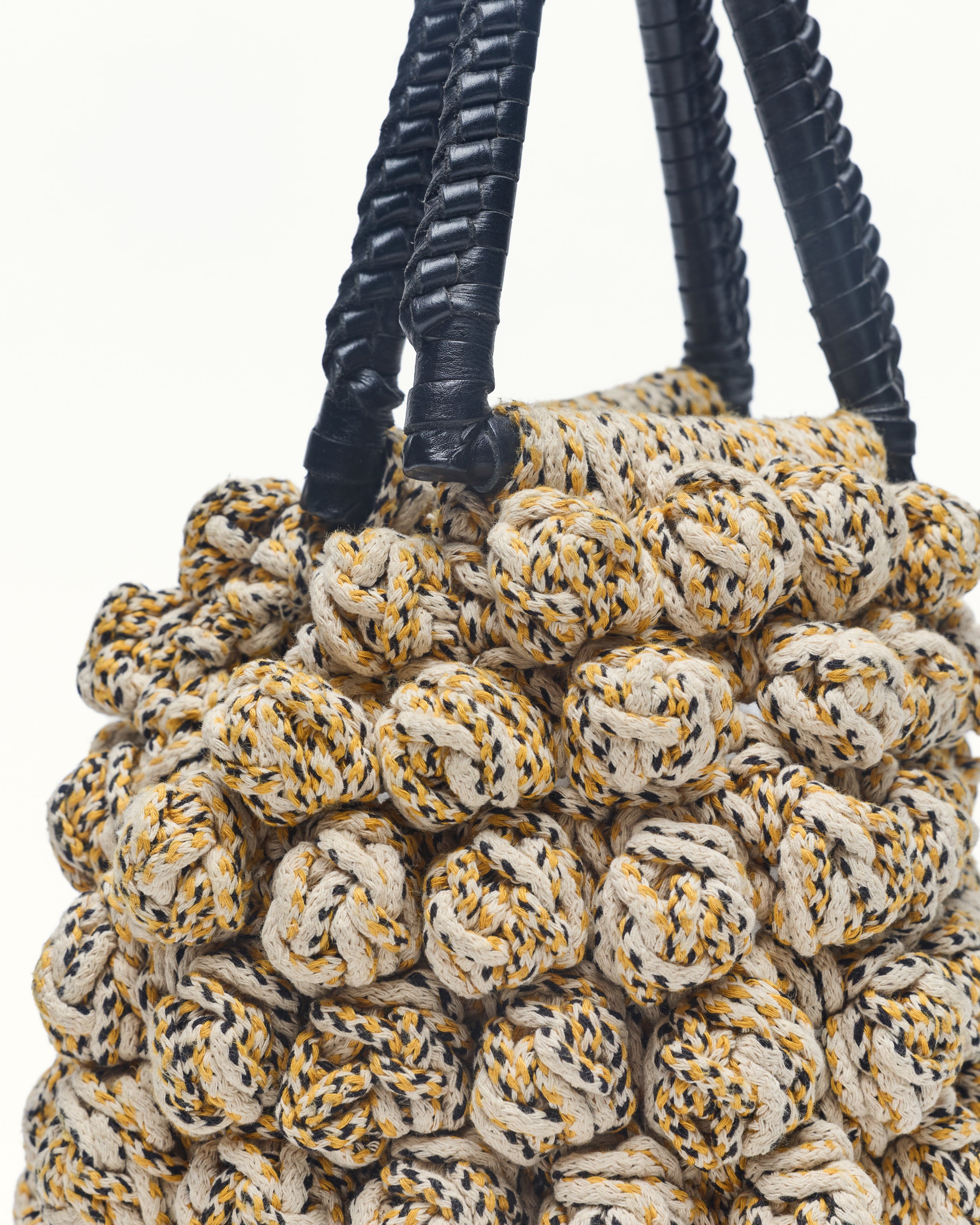 The bon bon bag crotchet is a small bag made from knitted crotchet Yarn with a soft, gathered shape. The bag features a rounded silhouette with a leather wrap handle at the top. It has a distinctive knotted and wrap detail all over.