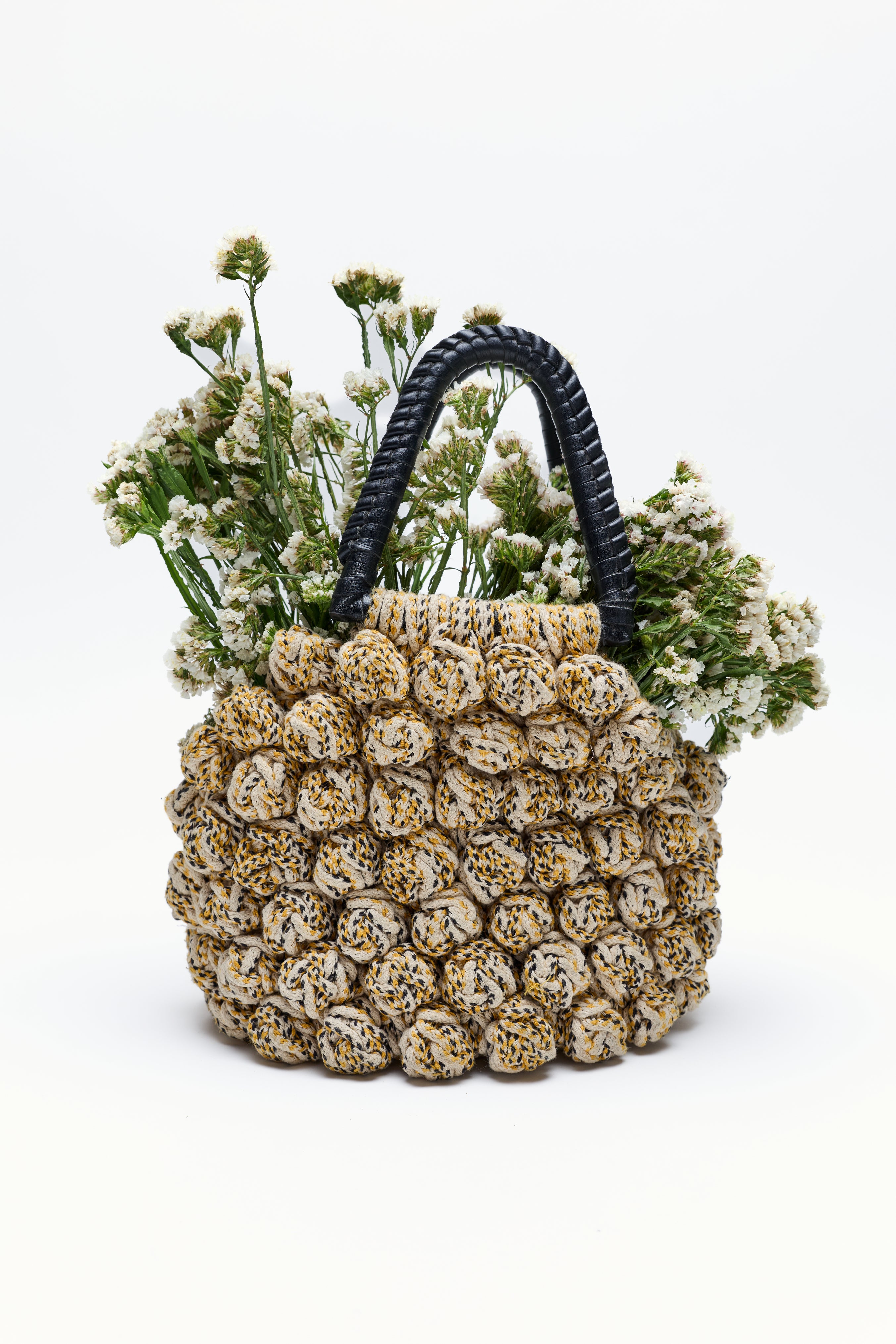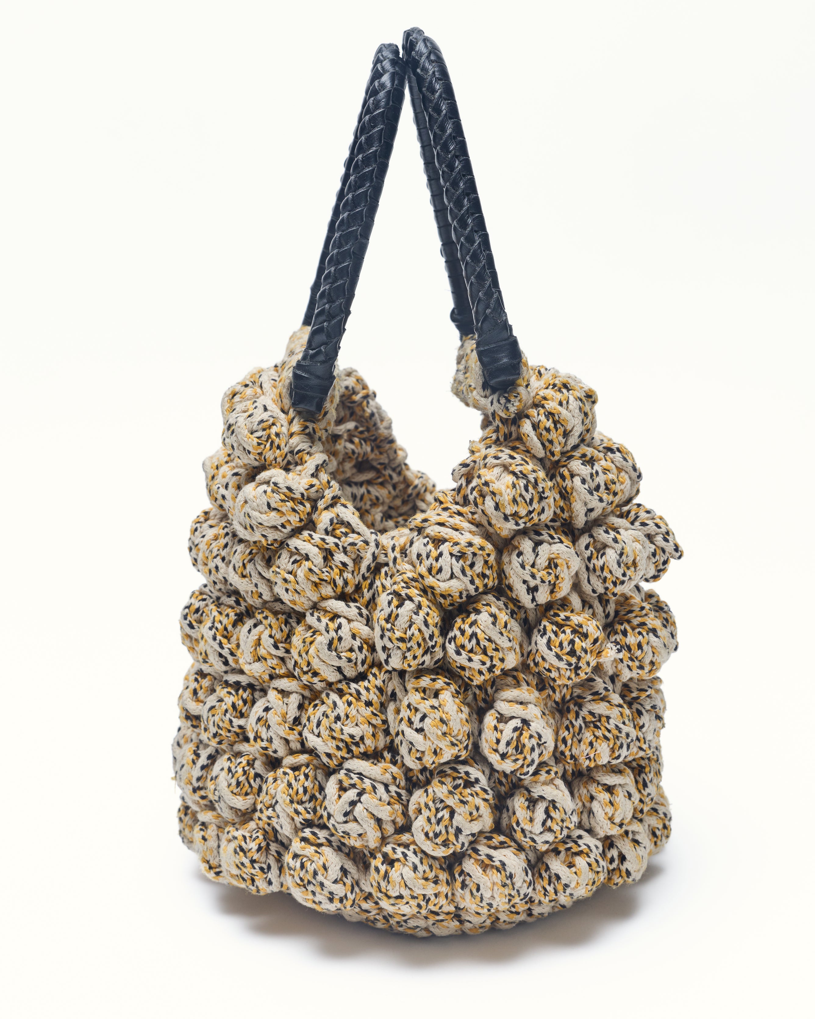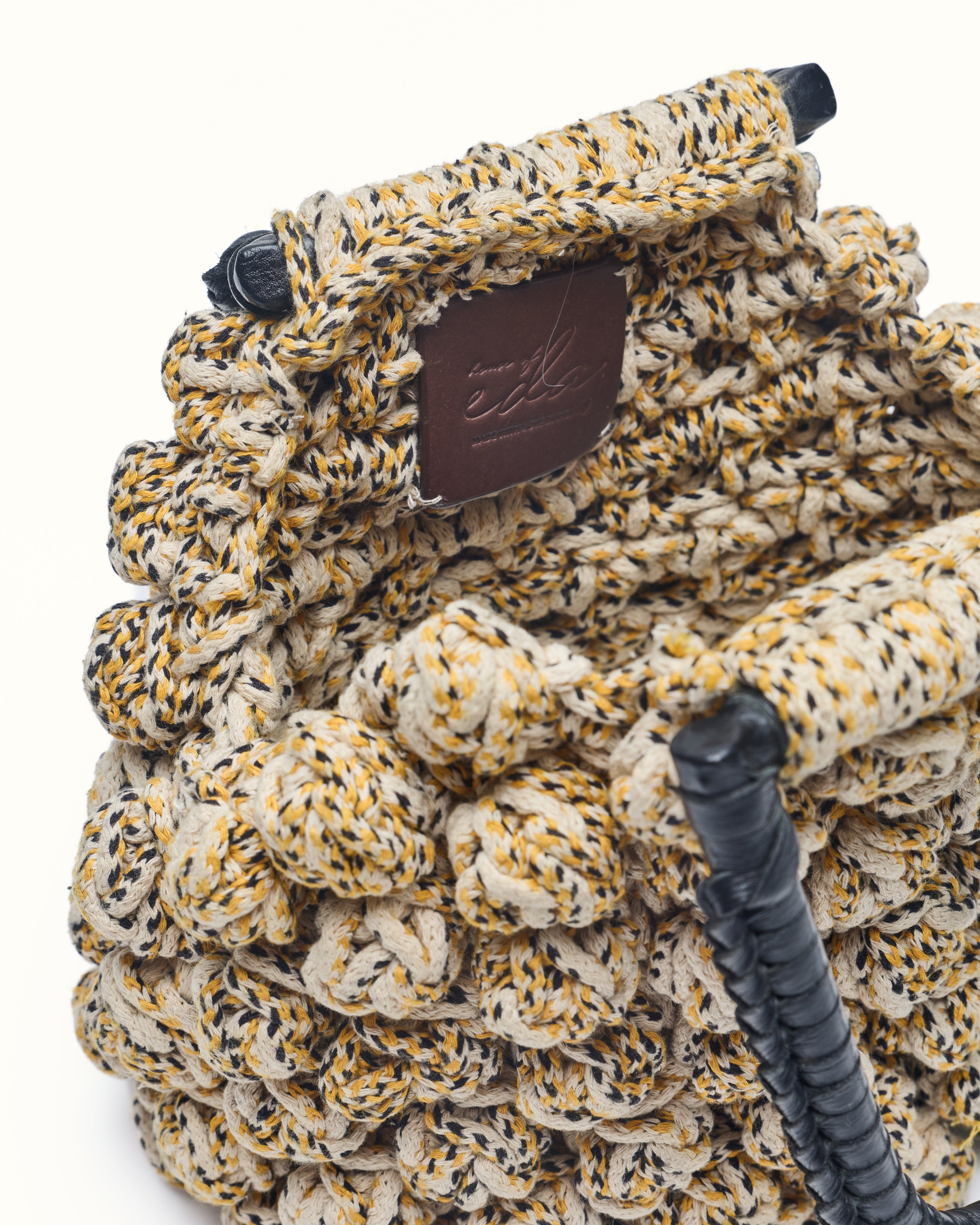 The bon bon bag crotchet is a small bag made from knitted crotchet Yarn with a soft, gathered shape. The bag features a rounded silhouette with a leather wrap handle at the top. It has a distinctive knotted and wrap detail all over.