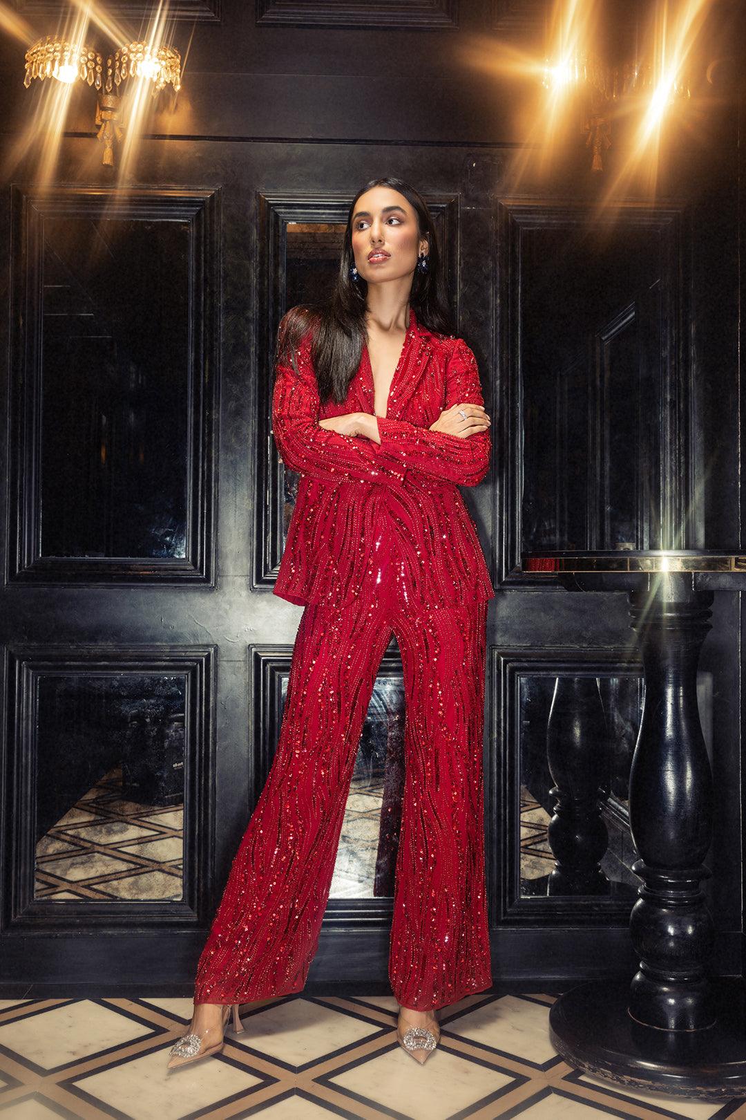 Our signature slim-cut blazer, now adorned with glass beads french cut sequins and crystals, quickly elevates your look to boss babe status. Proof that comfy and glamour can co-exist, these wide-leg trousers make a statement, while keeping things totally polished.