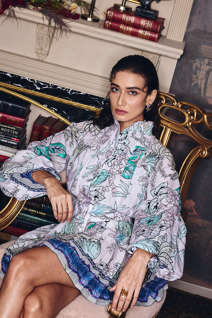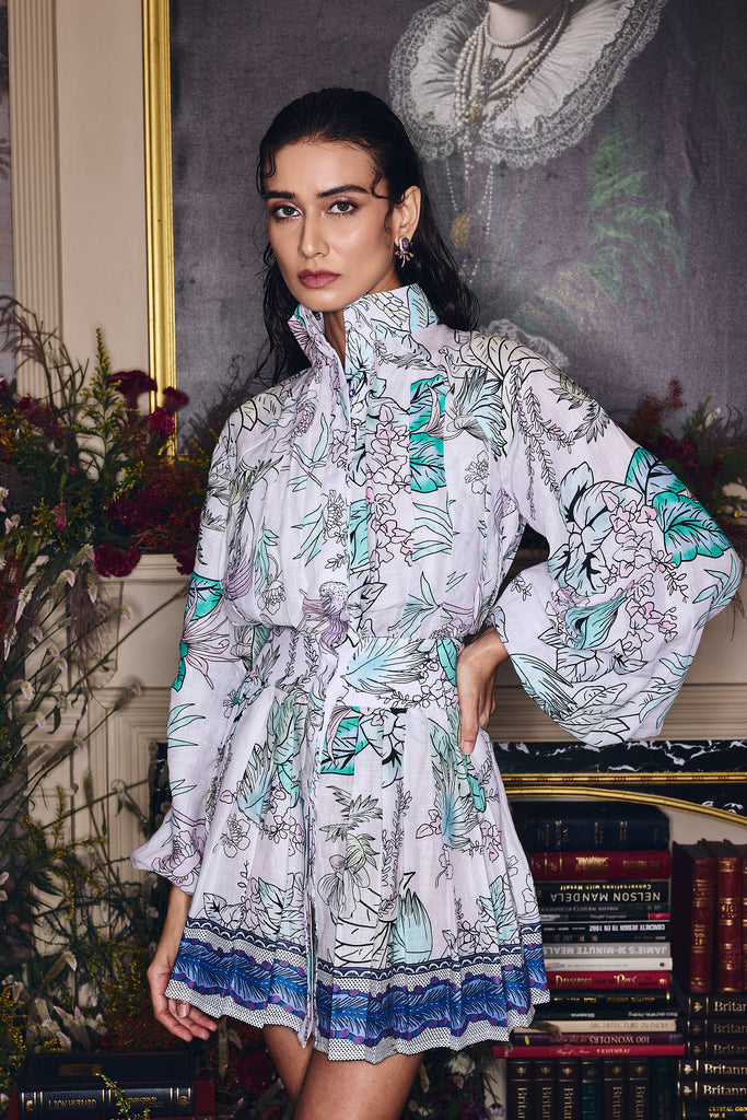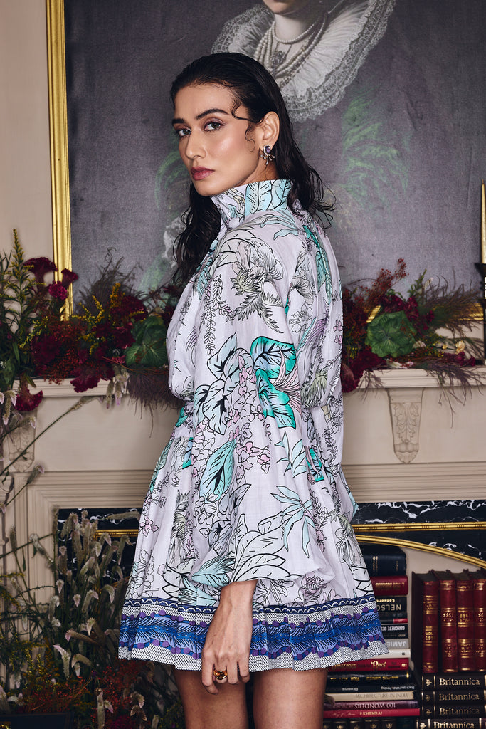 Anya leans into volume with balloon sleeves, a high neckline, and a tiered skirt cut in breezy printed silk linen. Front buttons add playful detail, keeping the silhouette equal parts polished and fun. It’s an easy choice for fall nights when you want a boho-leaning mini that still feels fresh, modern, and just a little bit flirty.