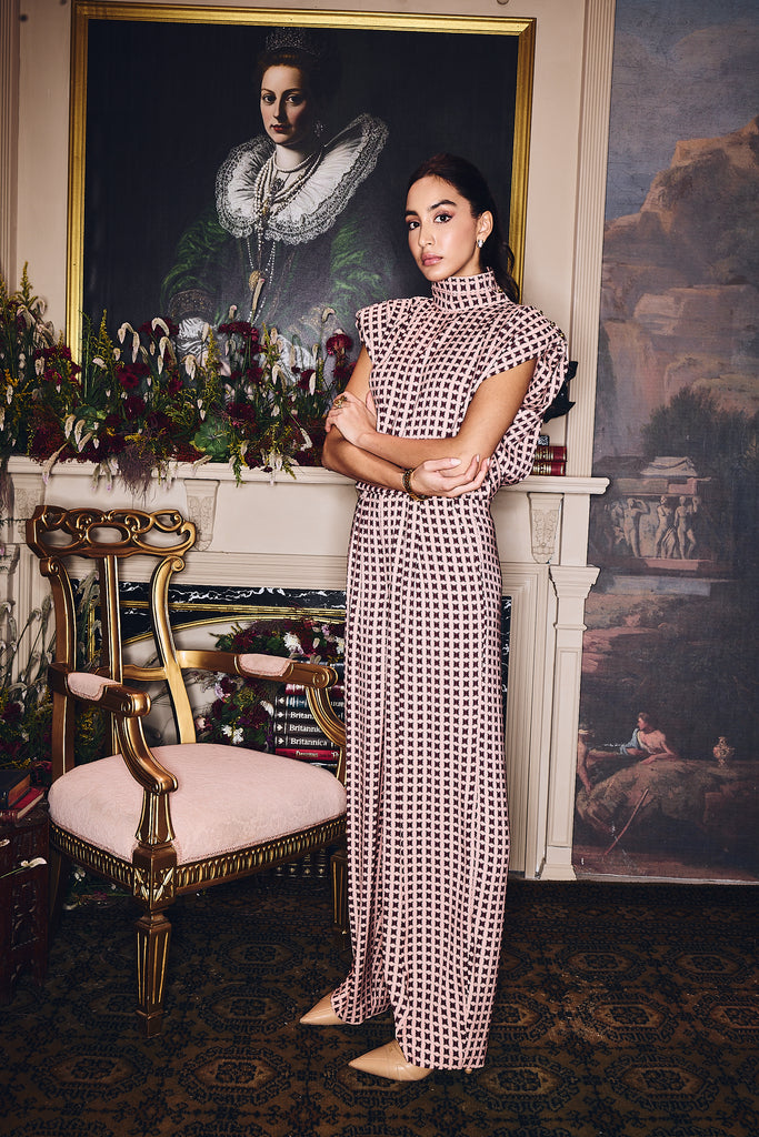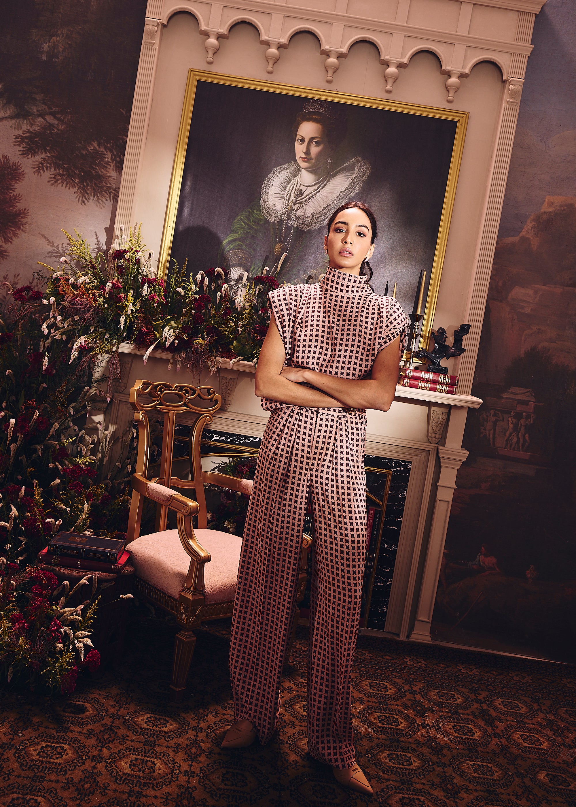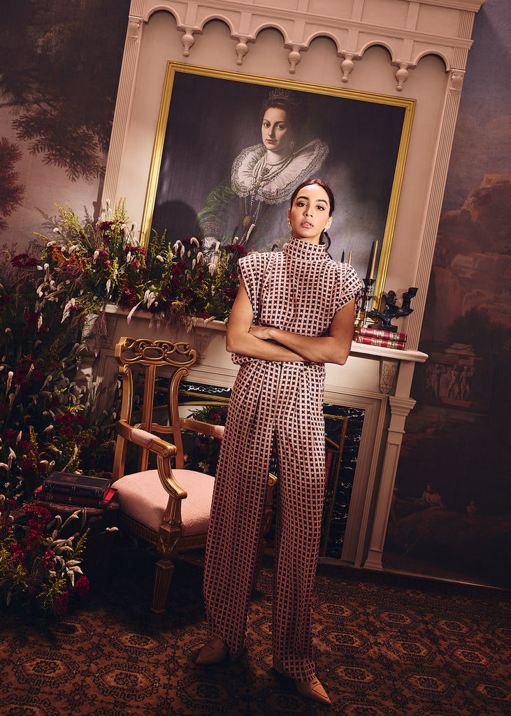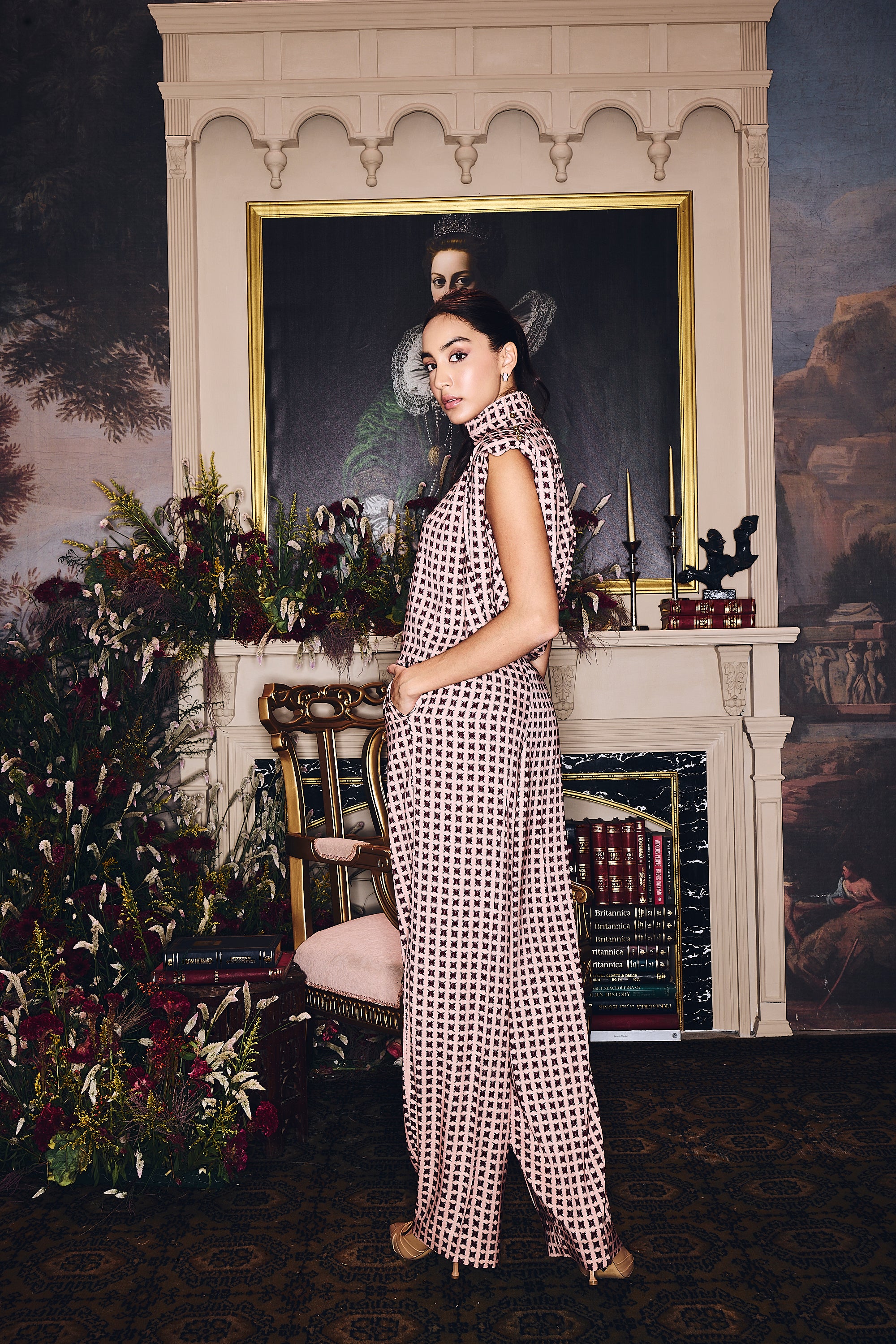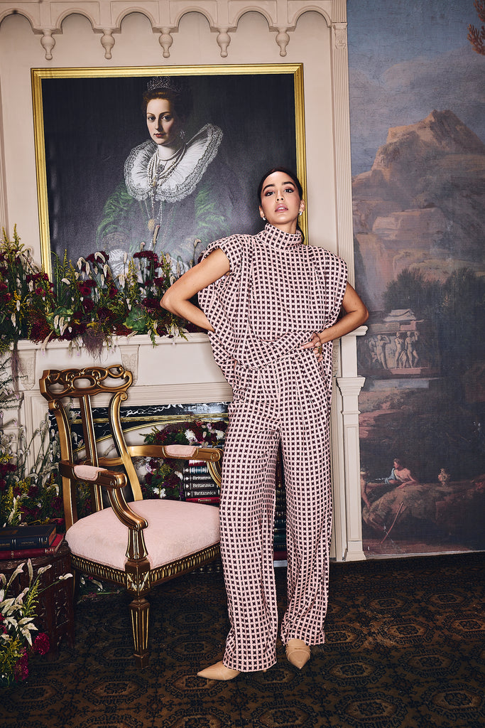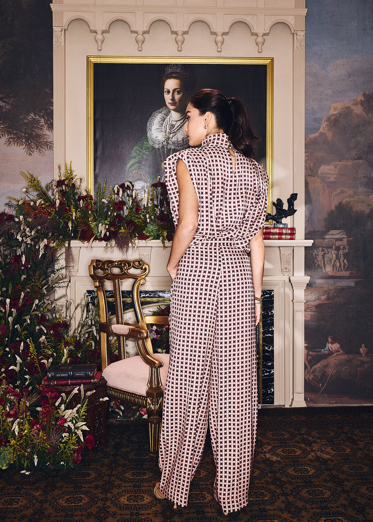 This pleated pant and strong shoulder boxy top is the perfect everyday option and can take you from coffee to cocktails. The top features padded shoulders and embellished buttons and pants include front pleats and a beautiful tailored silhouette in reminisense of the glamorous 80's, a beauty crafted in luxe silk.