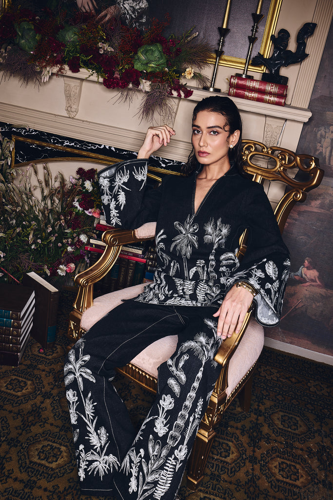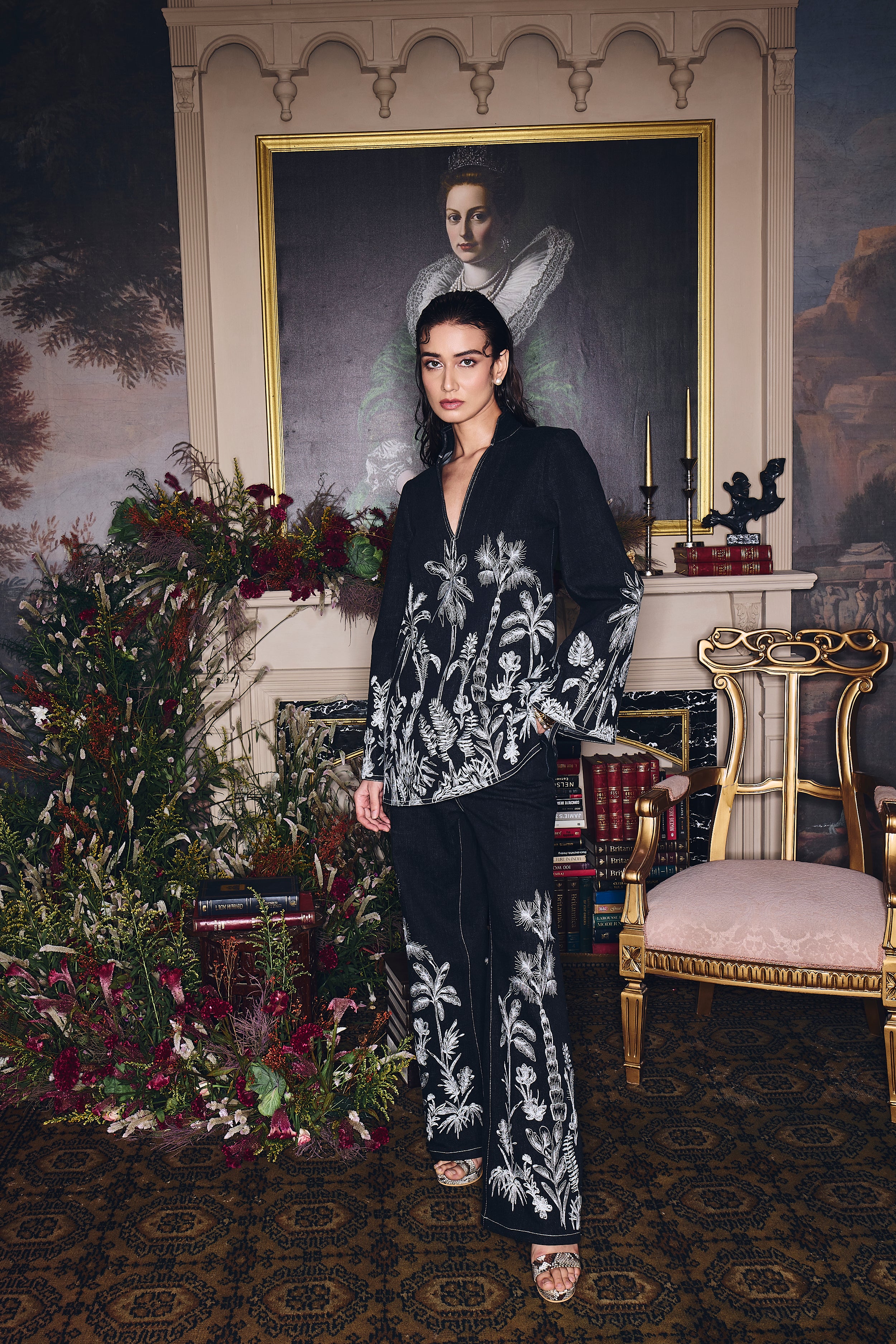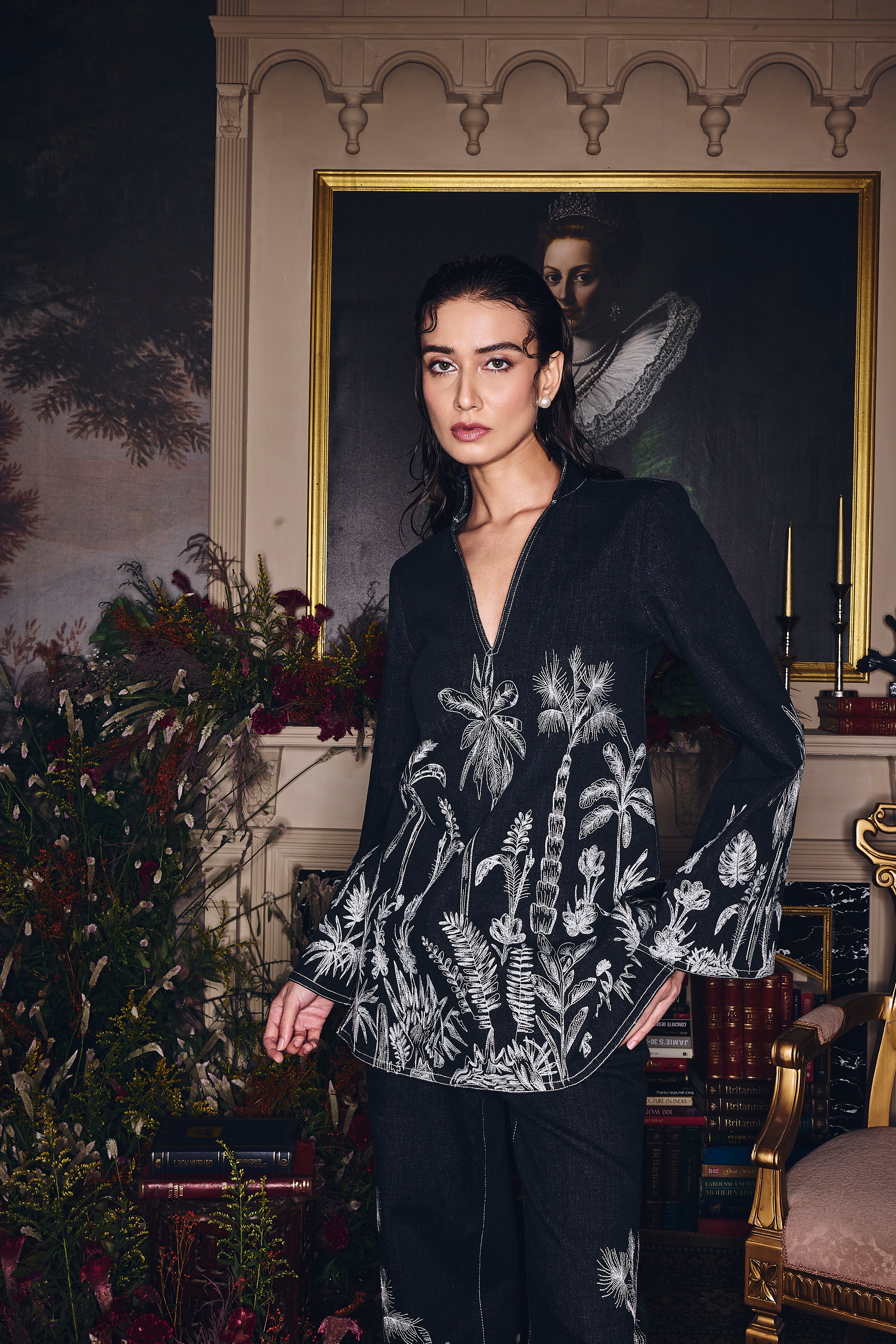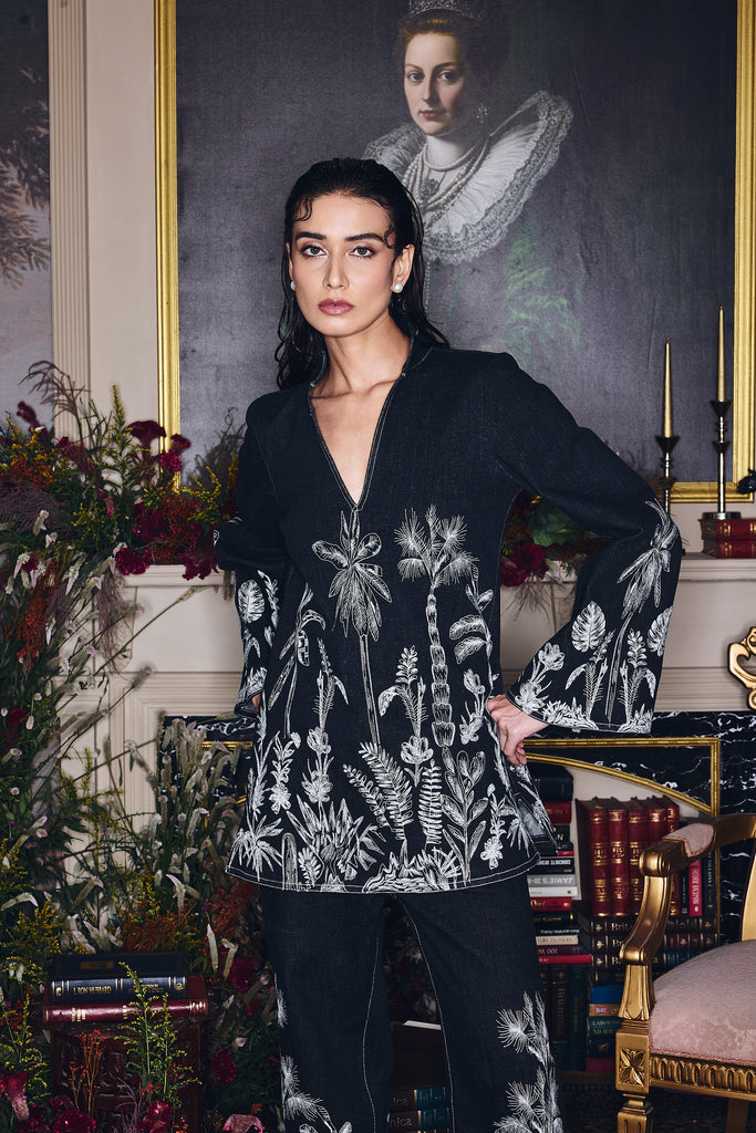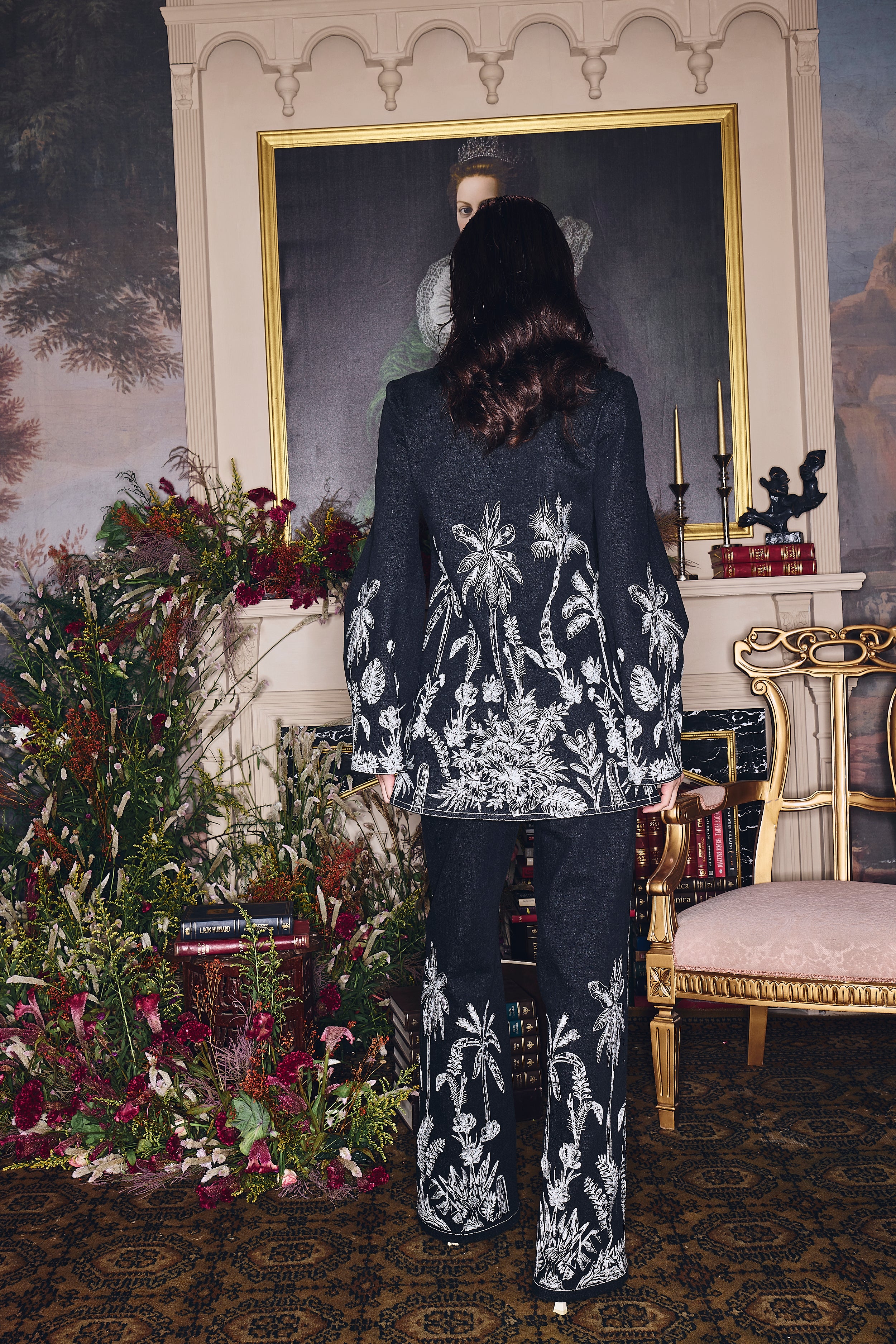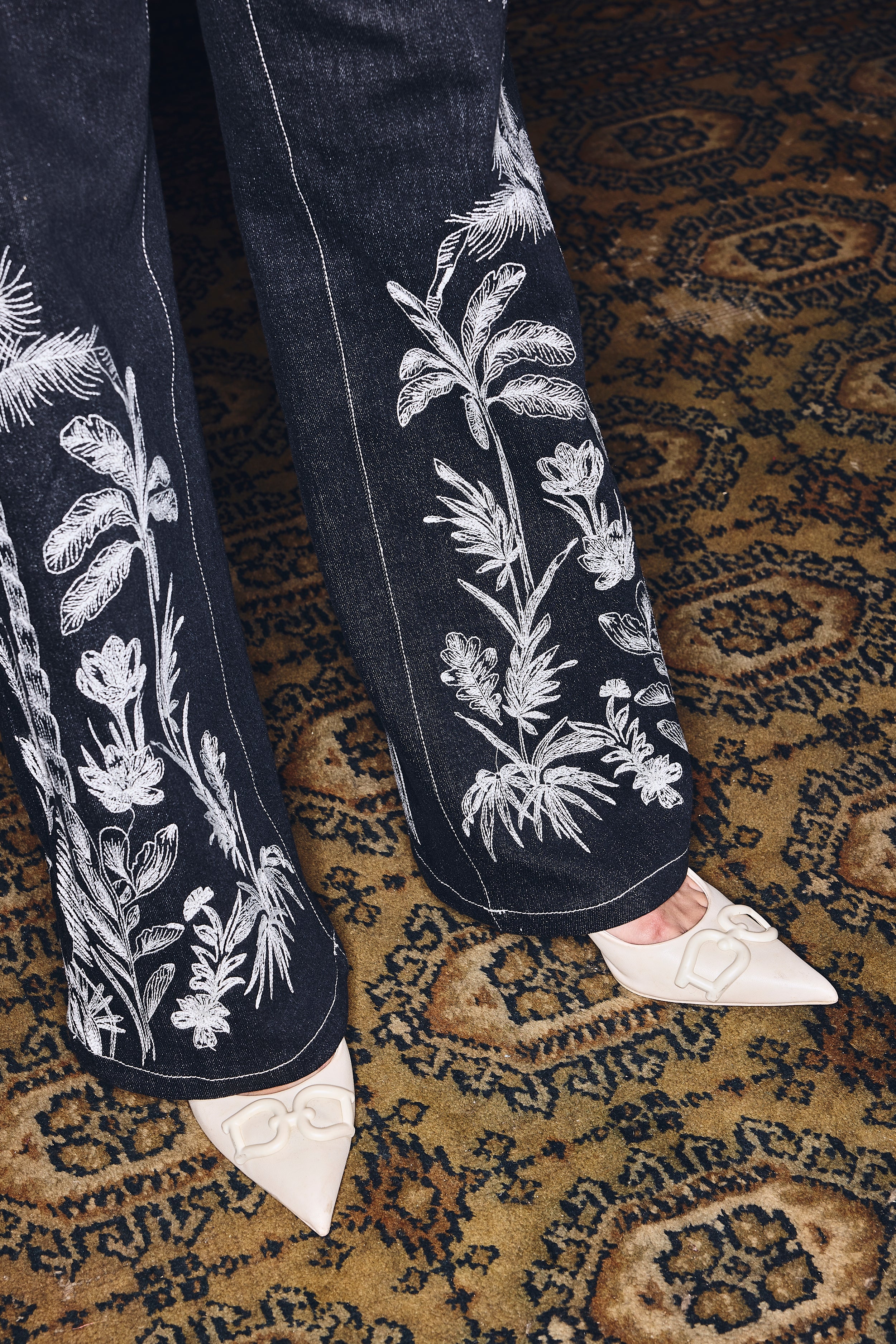 Proof that denim can do more. These high-rise flare denim top and jeans are made from stretch cotton denim and finished with intricate ivory embroidery that winds around the hem. Sculpting through the hip and flared at the leg, they’re what we call maximalist casual.