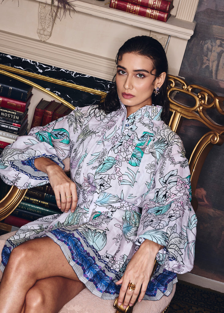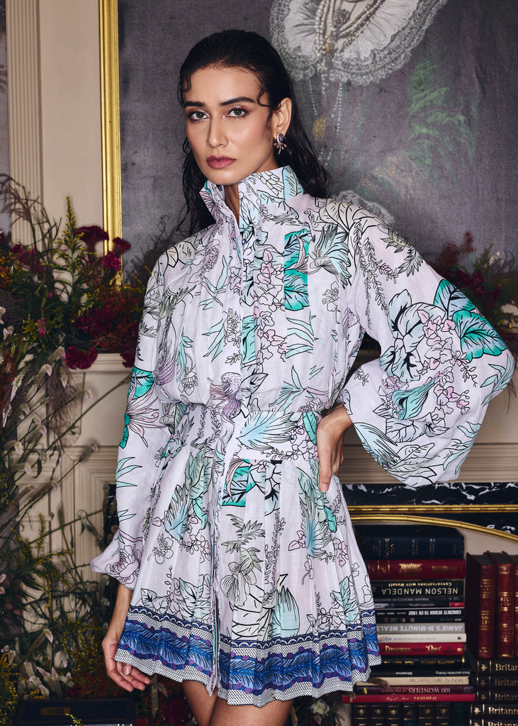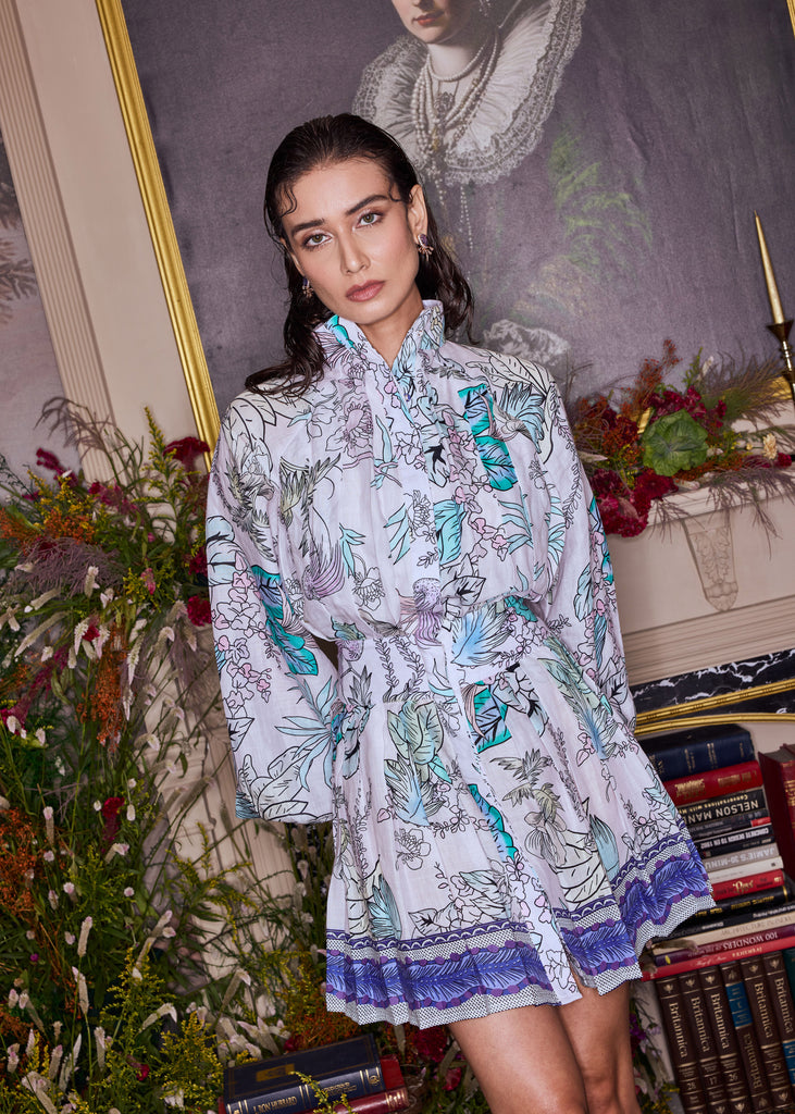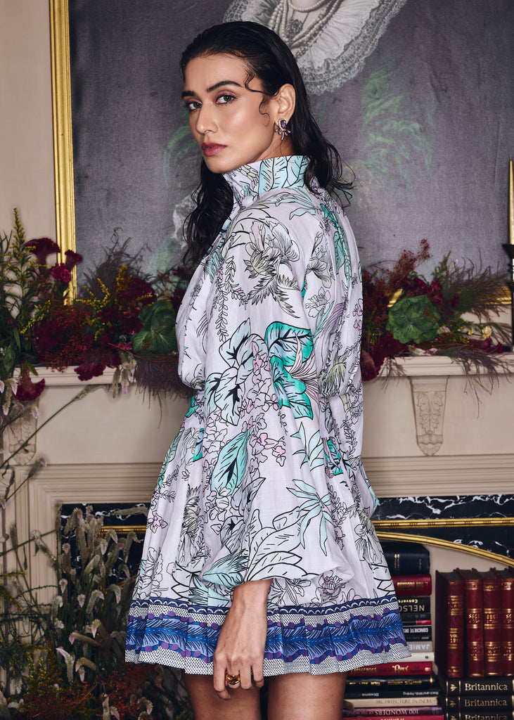 Anya leans into volume with balloon sleeves, a high neckline, and a tiered skirt cut in breezy printed silk linen. Front buttons add playful detail, keeping the silhouette equal parts polished and fun. It’s an easy choice for fall nights when you want a boho-leaning mini that still feels fresh, modern, and just a little bit flirty.