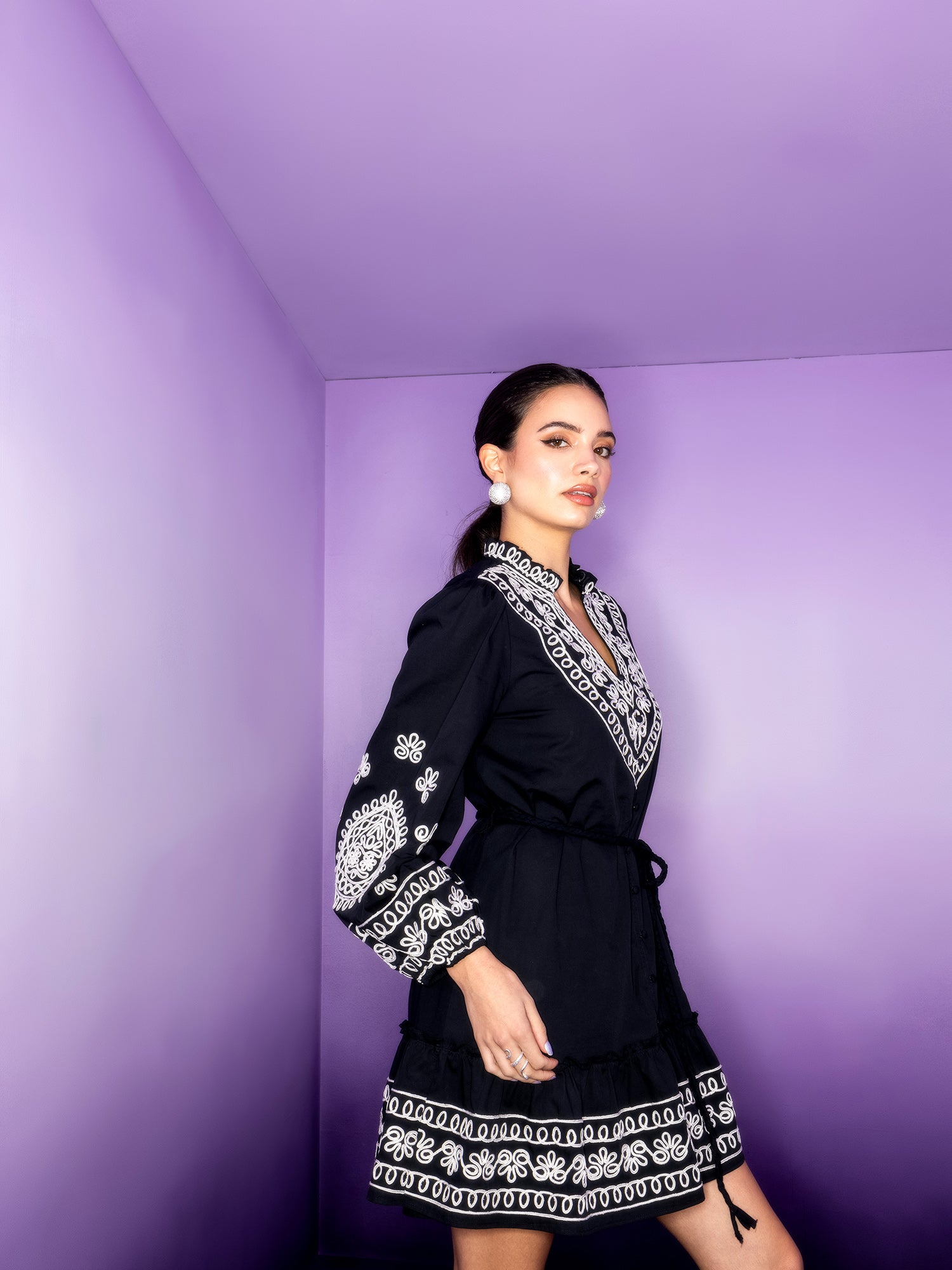 Your next go to black dress crafted on a fine poplin in butter soft finish with intricate details of hand done cording and thread embroidery, goes perfect with all footwear from sneakers to platform shoes