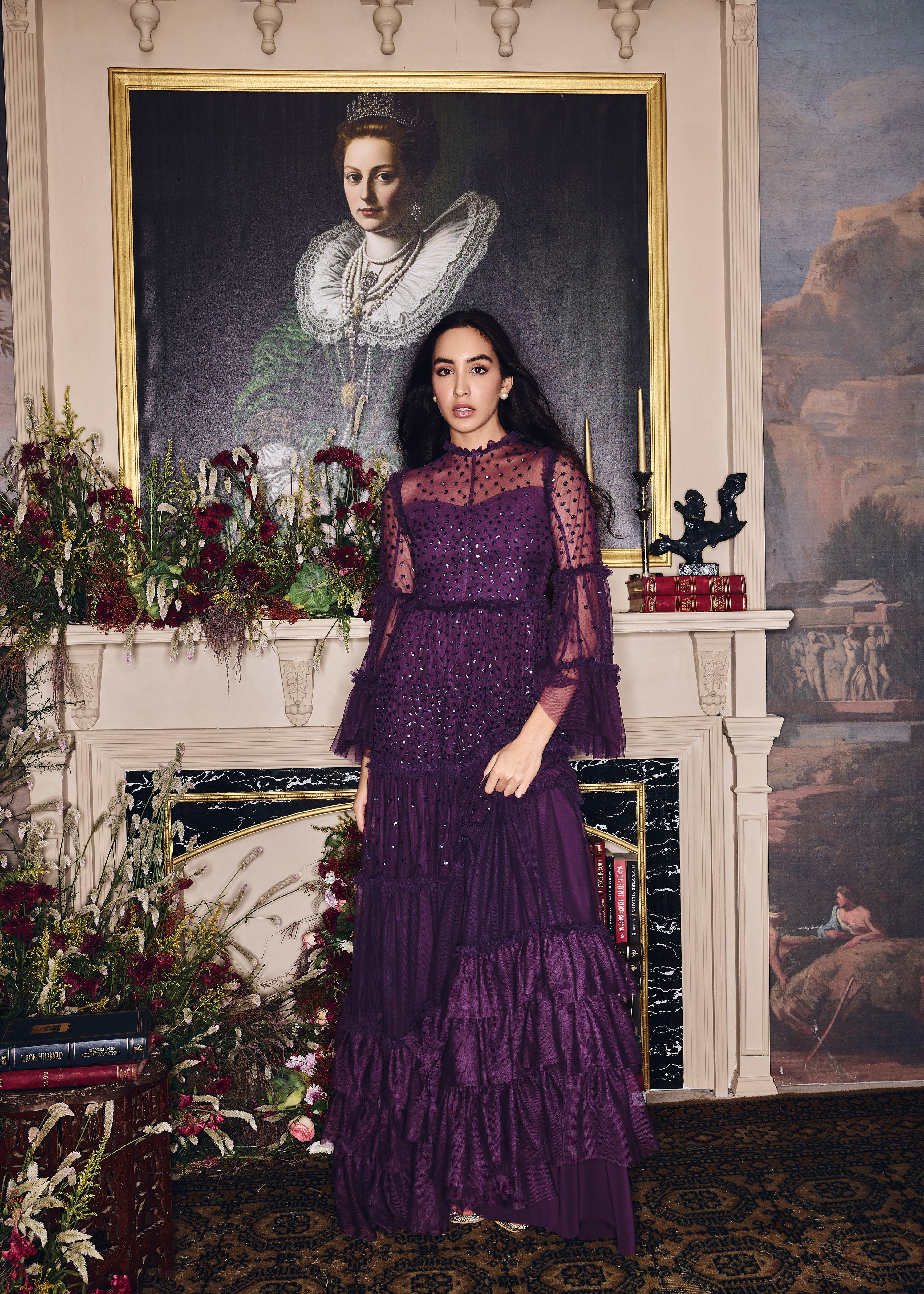 Romantic and ethereal, this embellished maxi dress is a vision of bohemian elegance. Crafted using delicate hand embellishment , the flowing silhouette drapes effortlessly, creating a dreamy, boho aesthetic. The high neckline, adorned with soft ruffles, adds a touch of Victorian charm, while the voluminous sleeves. The tiered hem, featuring cascading layers, adds depth and movement to the design. Perfect for special occasions.
