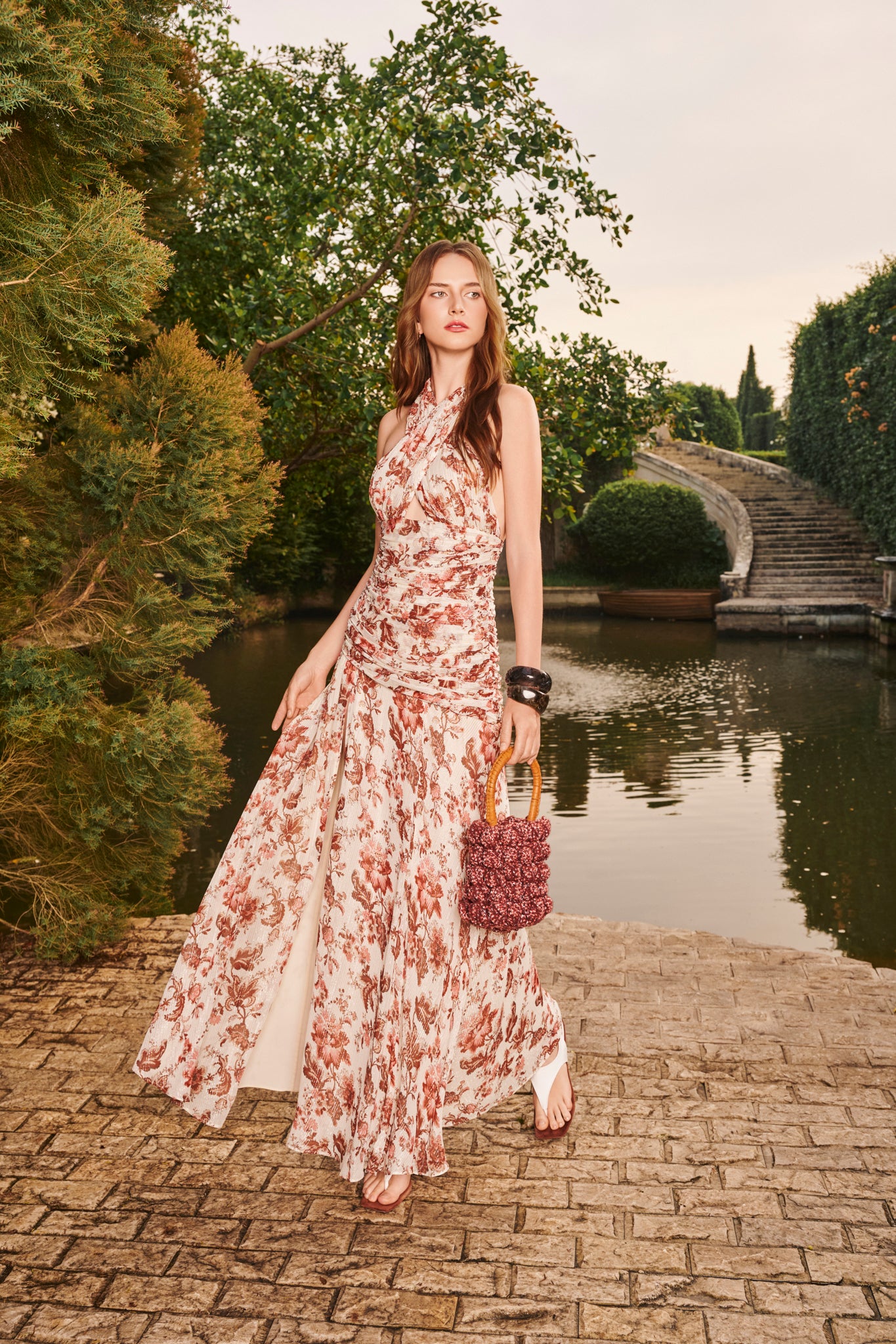 This Draped front maxi dress is crafted from silk chiffon with lurex inserts and designed to flatter, with halter neck, a deep V neckline. A high slit adds drama while keeping the silhouette light and fluid. Romantic yet confident, it works just as well for relaxed gatherings with flats as it does for special occasions styled with heels.
