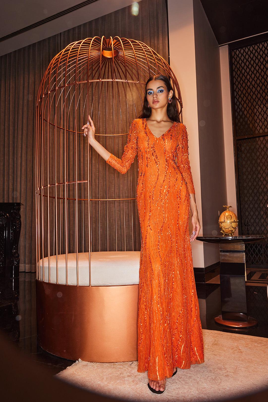 Dramatic hand beading embellishes this french lace gown, designed with an elegant floor-sweeping silhouette