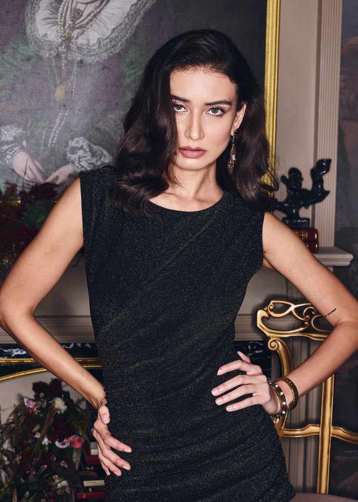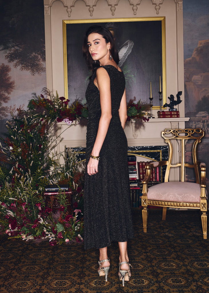 Arden is an ethereal Jacquard knit dress with a twist- its lightweight viscose lurex blend knit is dusted in shimmer. A draped bodice and asymmetrical hemline add to its flowing elegance, while a midi length keeps it classic. Designed to move like liquid, it catches the light beautifully on a dance floor. The perfect marriage of ease and extravagance, it’s made to shine.