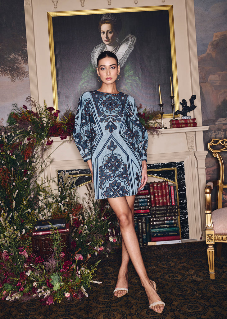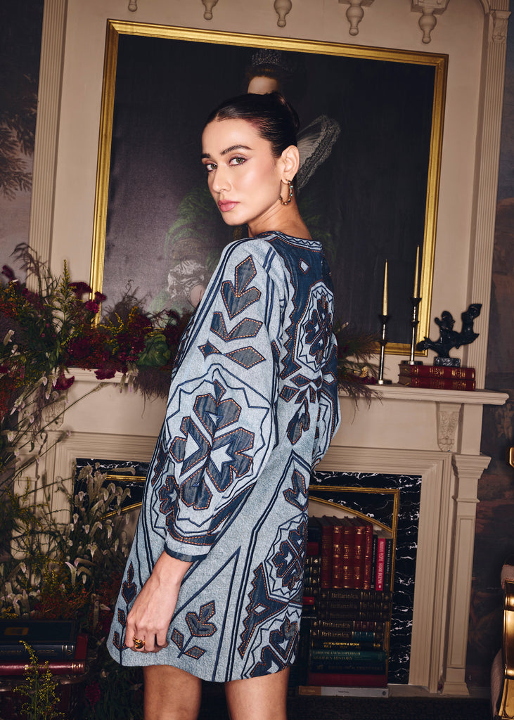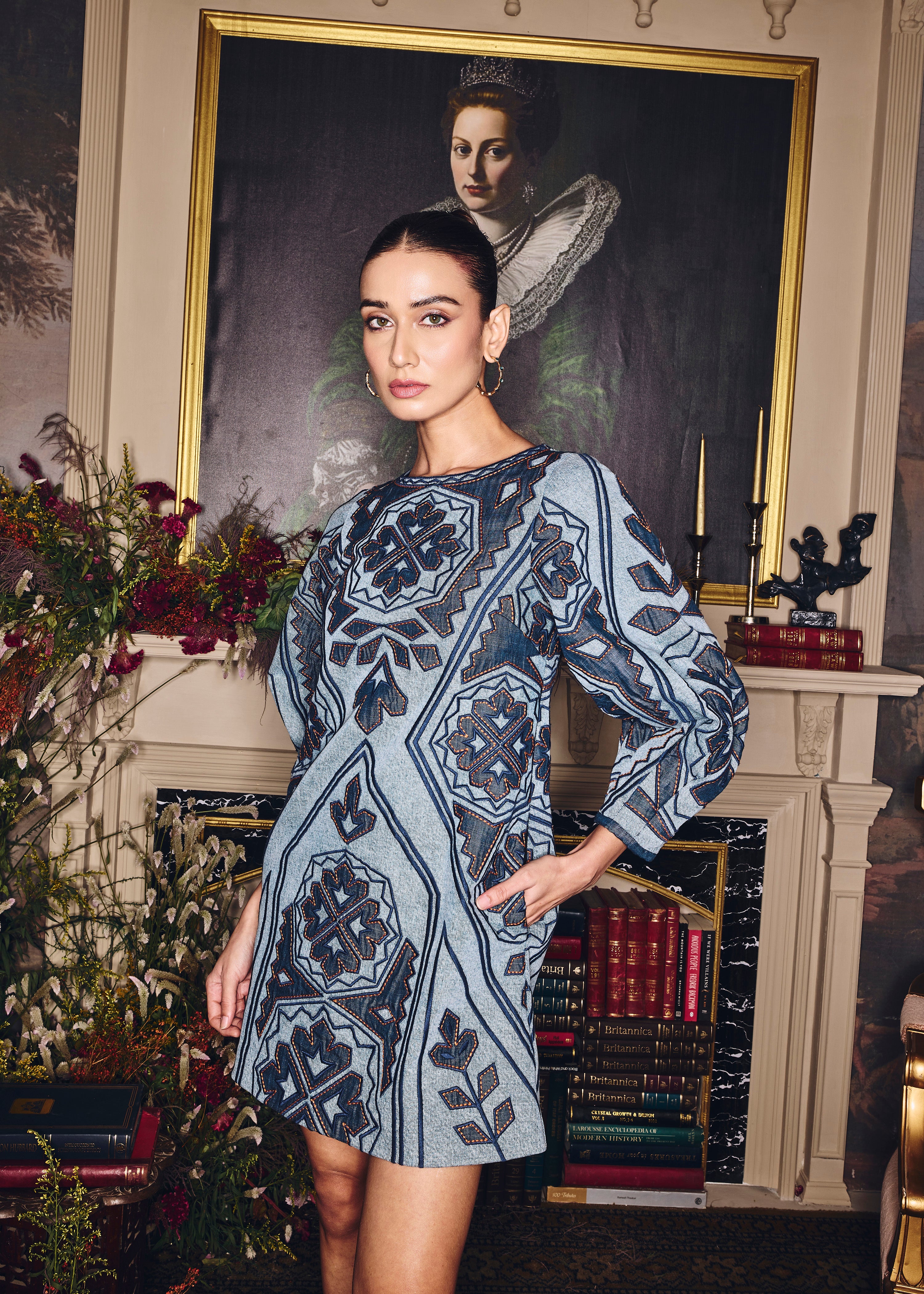 Thea Dress is one of our signature silhouettes- voluminous sleeves, relaxed through the body, and finished with an intricate deniim on denim applique embroidery. This blue patterned dress gets a romantic twist in intricately set thread stitches along the applique embroidered artwork. Wear it with anything from your sneakers to a high heel or slip into your sandals, this dress is easiest to carry.