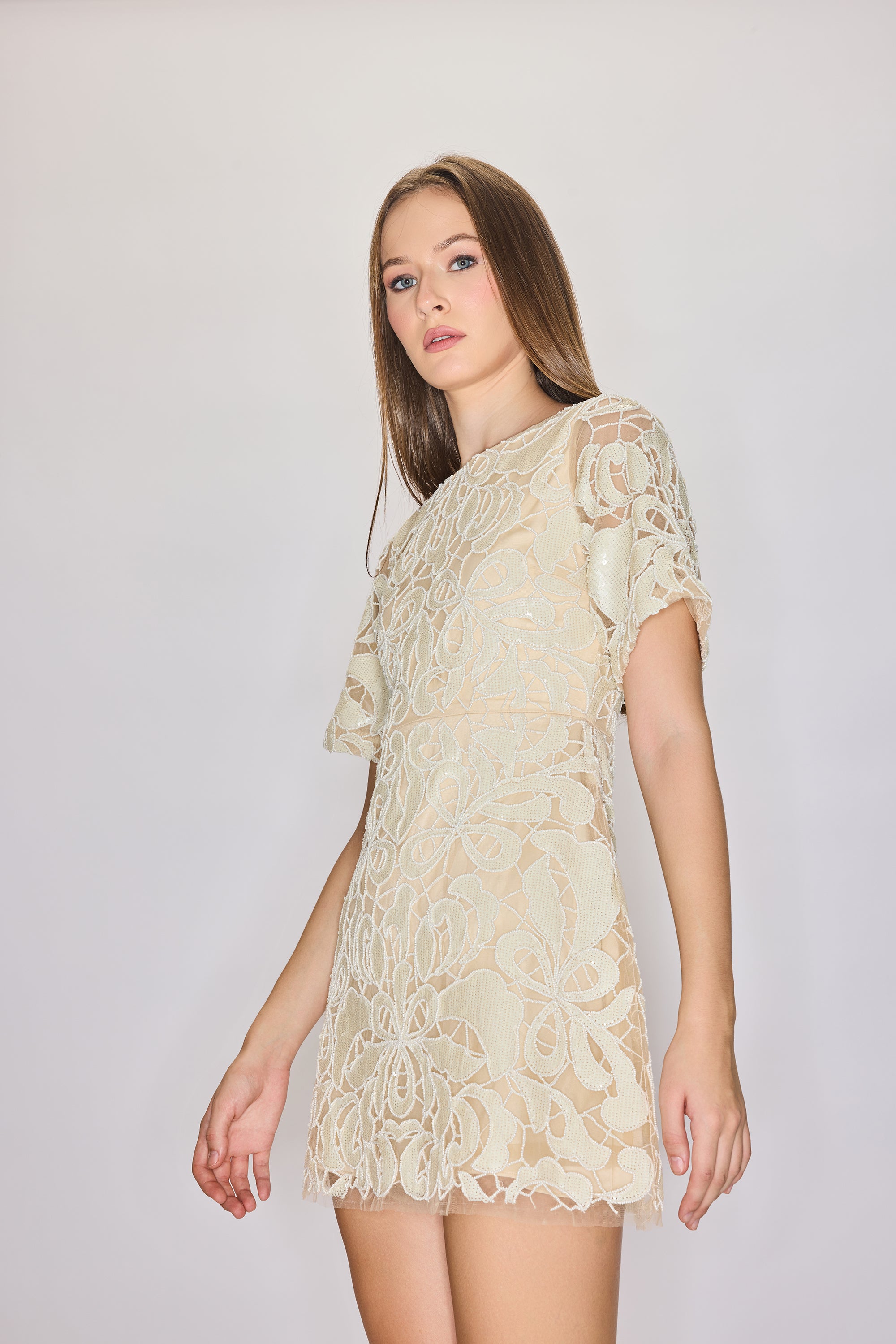 This minidress is a total stunner with embellished sequins and glass beads throughout. It features a flattering fit on upper and A line skirt and flared sleeves. It's a little '60s mod in the very best way. Model is wearing UK 6 and her measurements are 5’8”, 32” bust, 26” waist, 36” hips