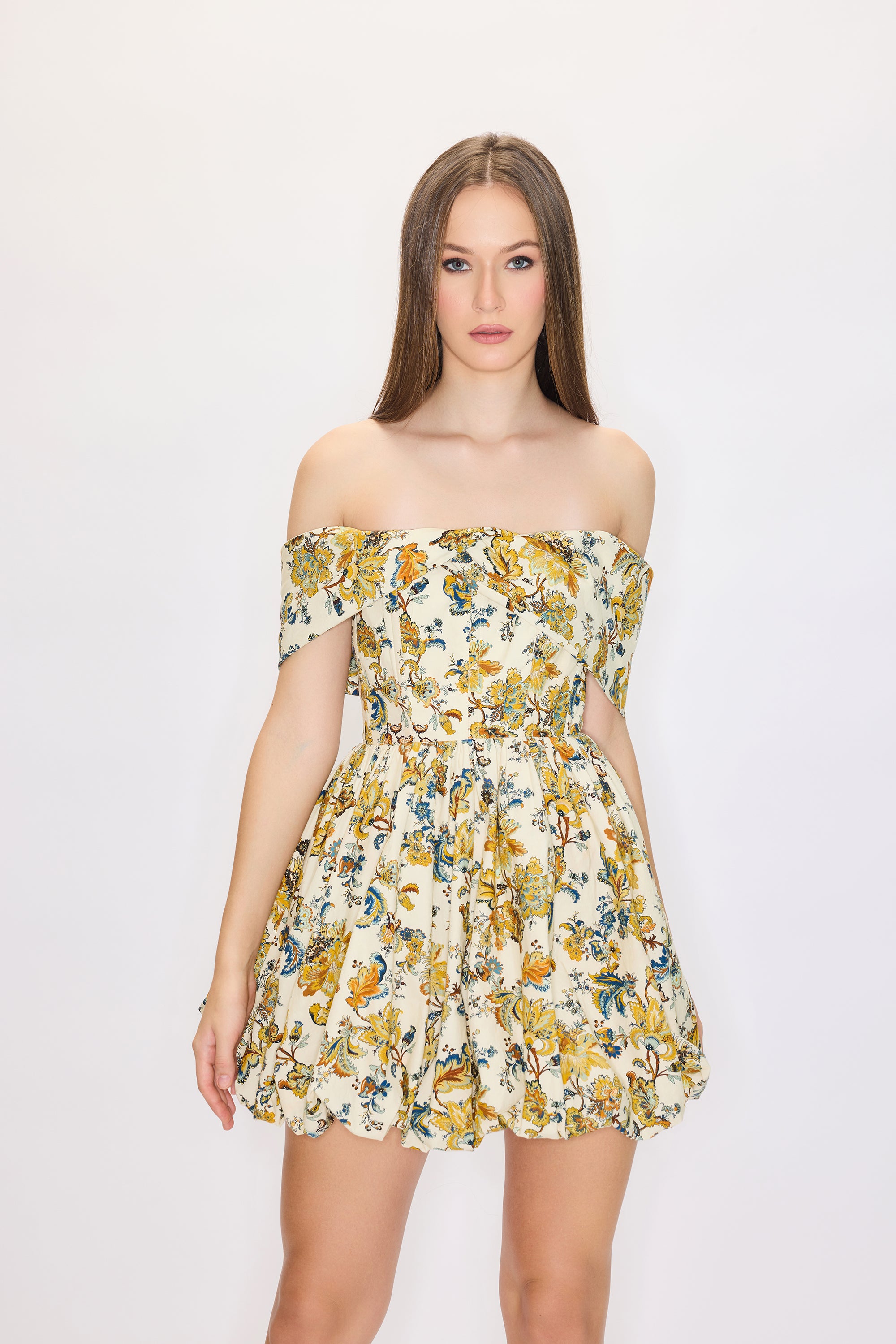 Ballet-core gets a makeover in our new take with draped off shoulder sleeves. Its beautiful floral print and playful bubble hem create a flirty, voluminous silhouette that’s perfect for any occasion.