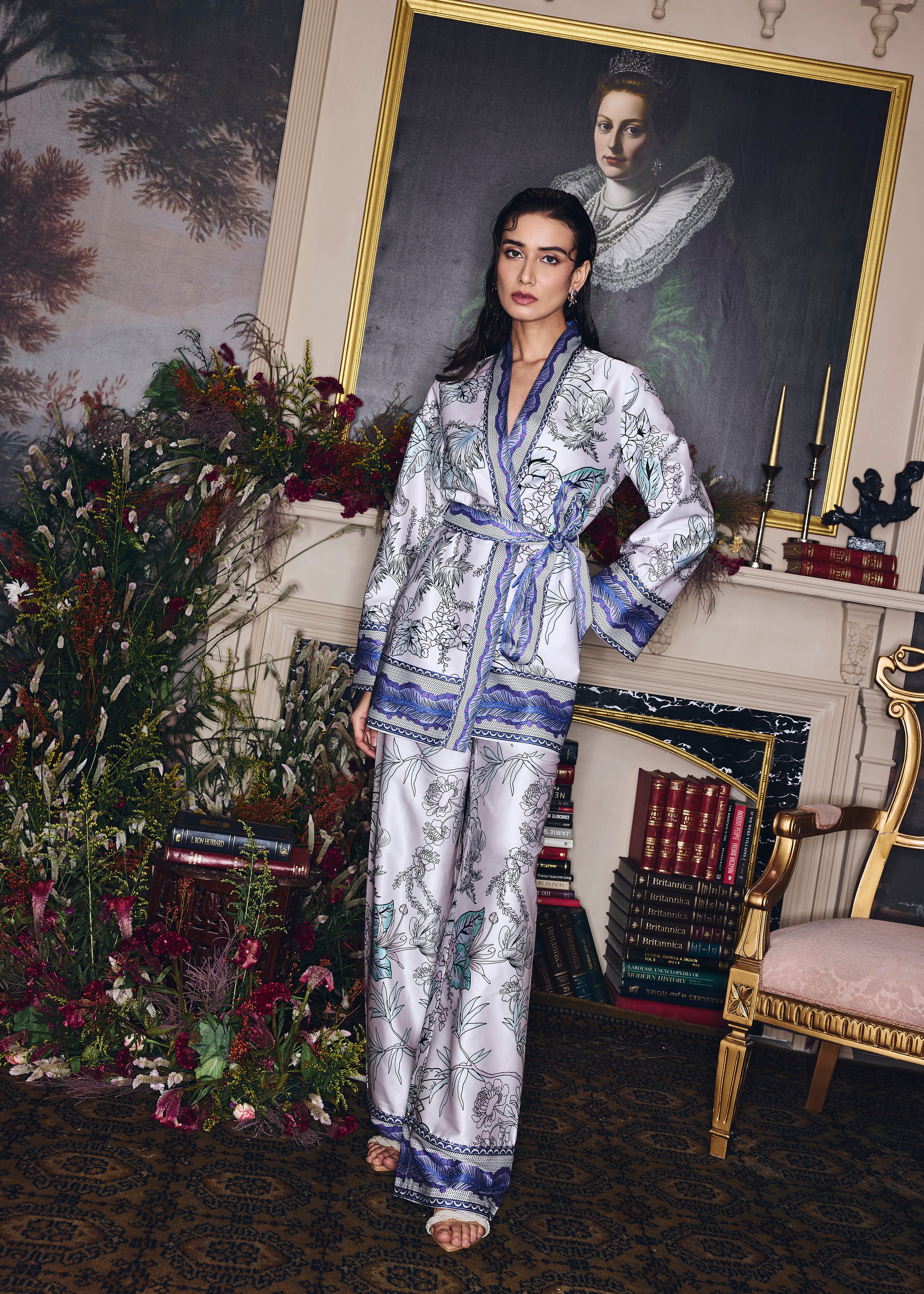 A printed kimono and pants co ord that does the most. The Anya co ord is breezy and refined with a blend of luxe and lounge, cut in silky satin back crepe that feels as good as it looks. Pair with your slip ons or heels for the full statement-or tone it down with a tank top.
