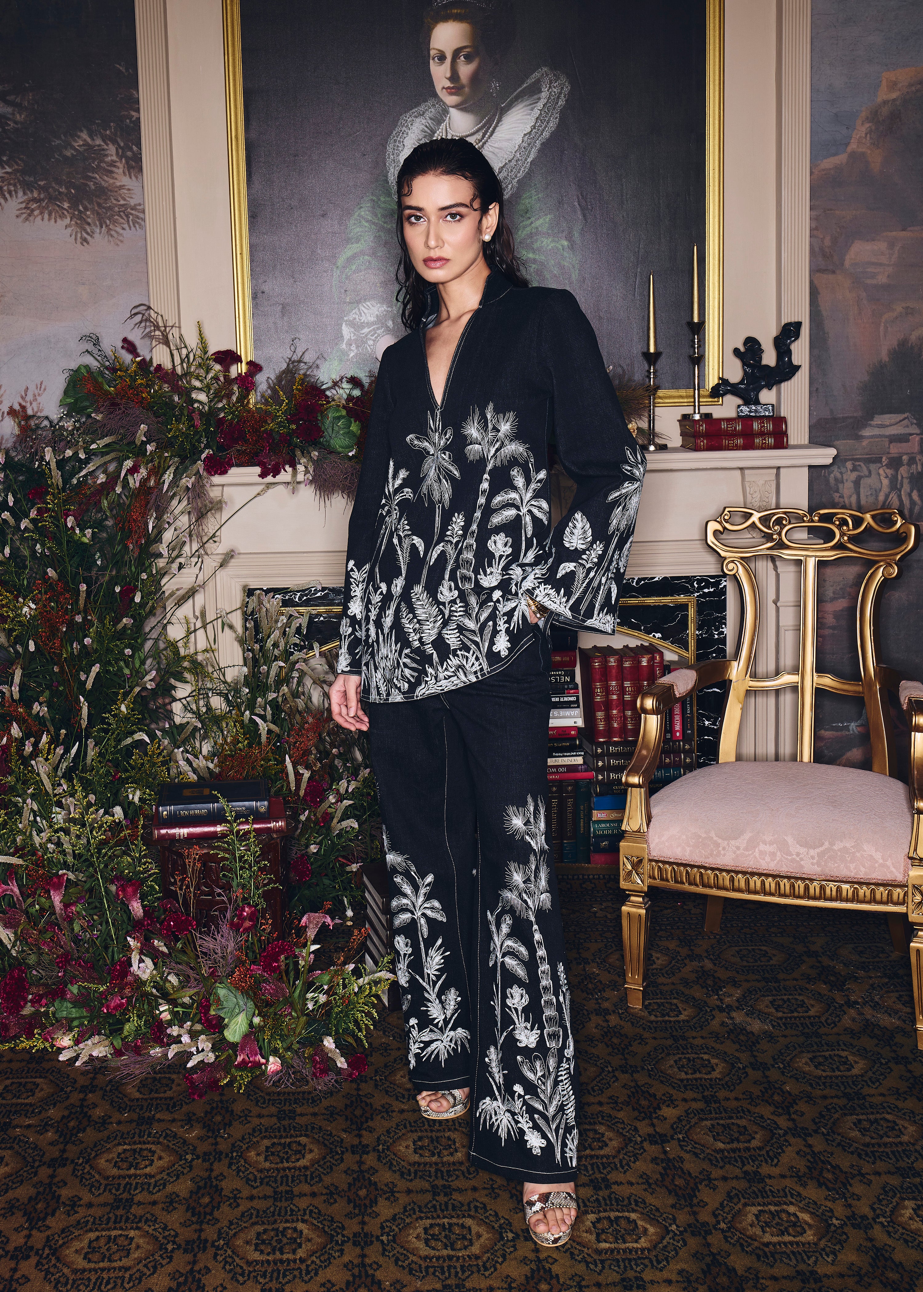 Proof that denim can do more. These high-rise flare denim top and jeans are made from stretch cotton denim and finished with intricate ivory embroidery that winds around the hem. Sculpting through the hip and flared at the leg, they’re what we call maximalist casual.