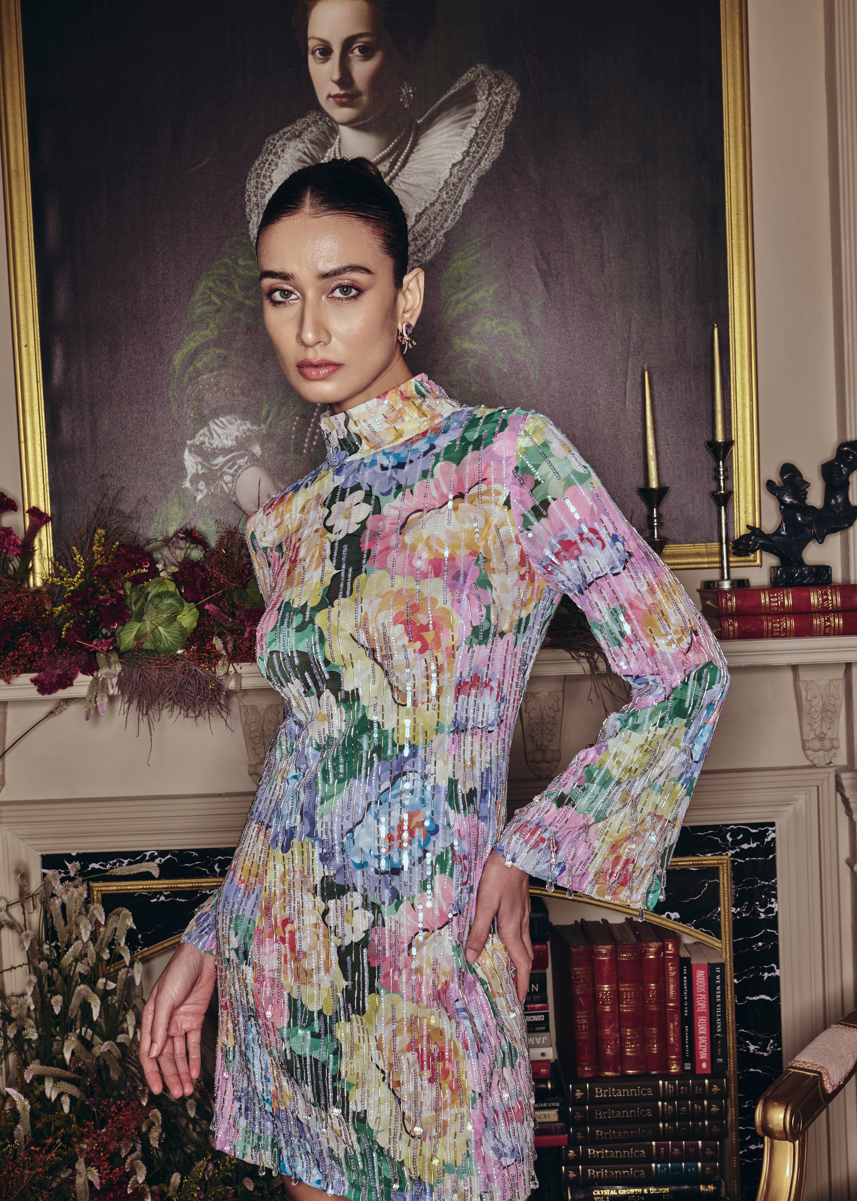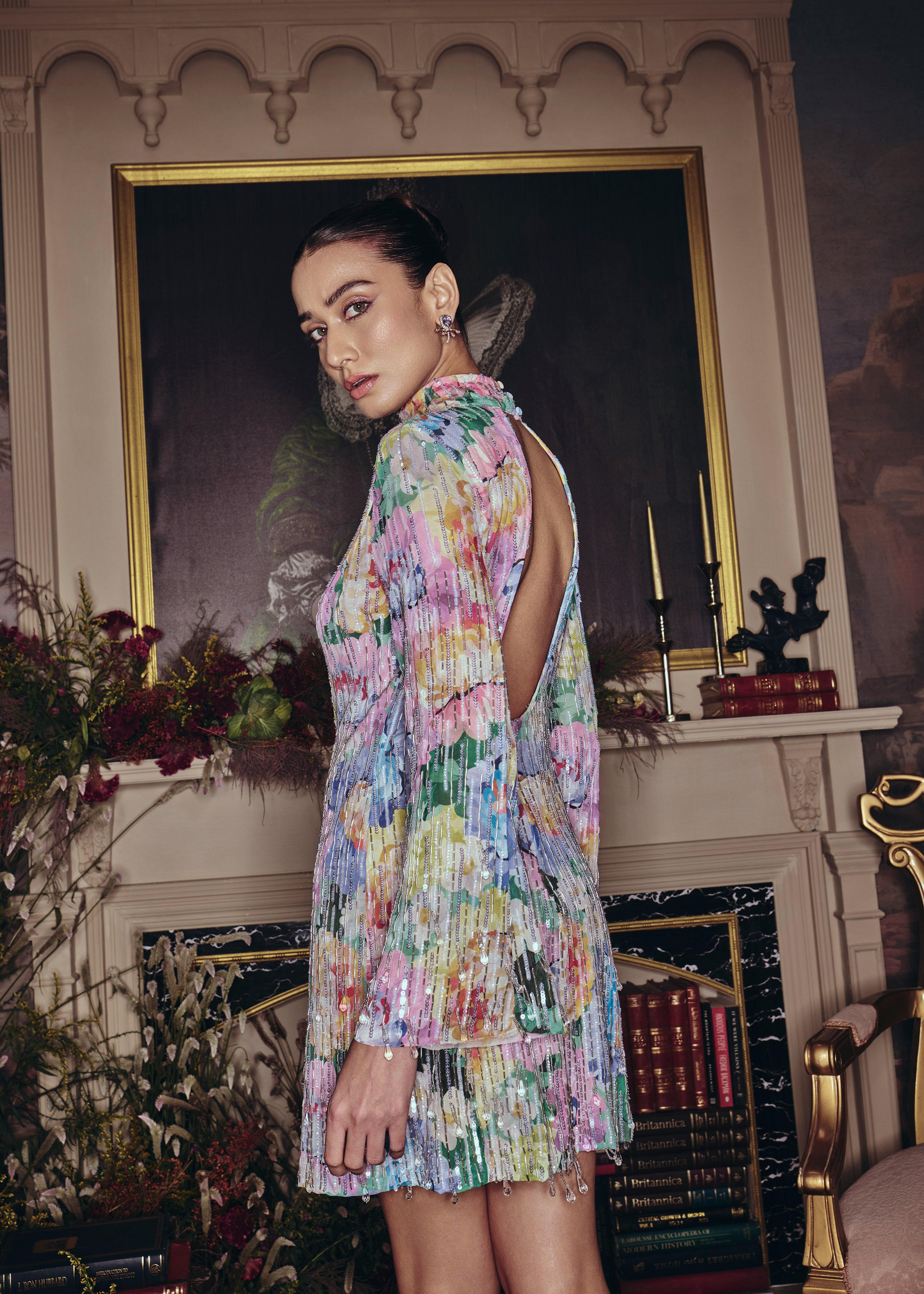 A picture perfect moment worth making an entrance for. Our dylyn dress stuns in shimmering hand embellished crystals, designed with an 70's shift silhouette that flatters and flows with every move. The plunging back adds a touch of allure, while a stretch fabric ensure a smooth, comfortable fit. Finished with a subtle sheen and striking detail, this standout style is guaranteed to be a conversation piece.