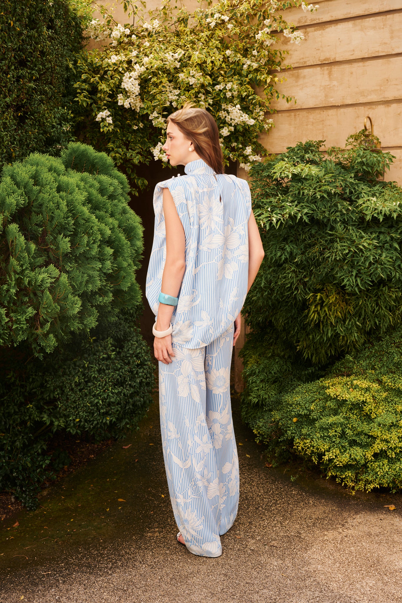 Our best seller gets a new summer twist, Floral Stripe print on Silk twill embellished with Raw cut Pearl buttons. Works beautifully as a co ord and equally well as separates. Pair freely with your favorite heels or flats.