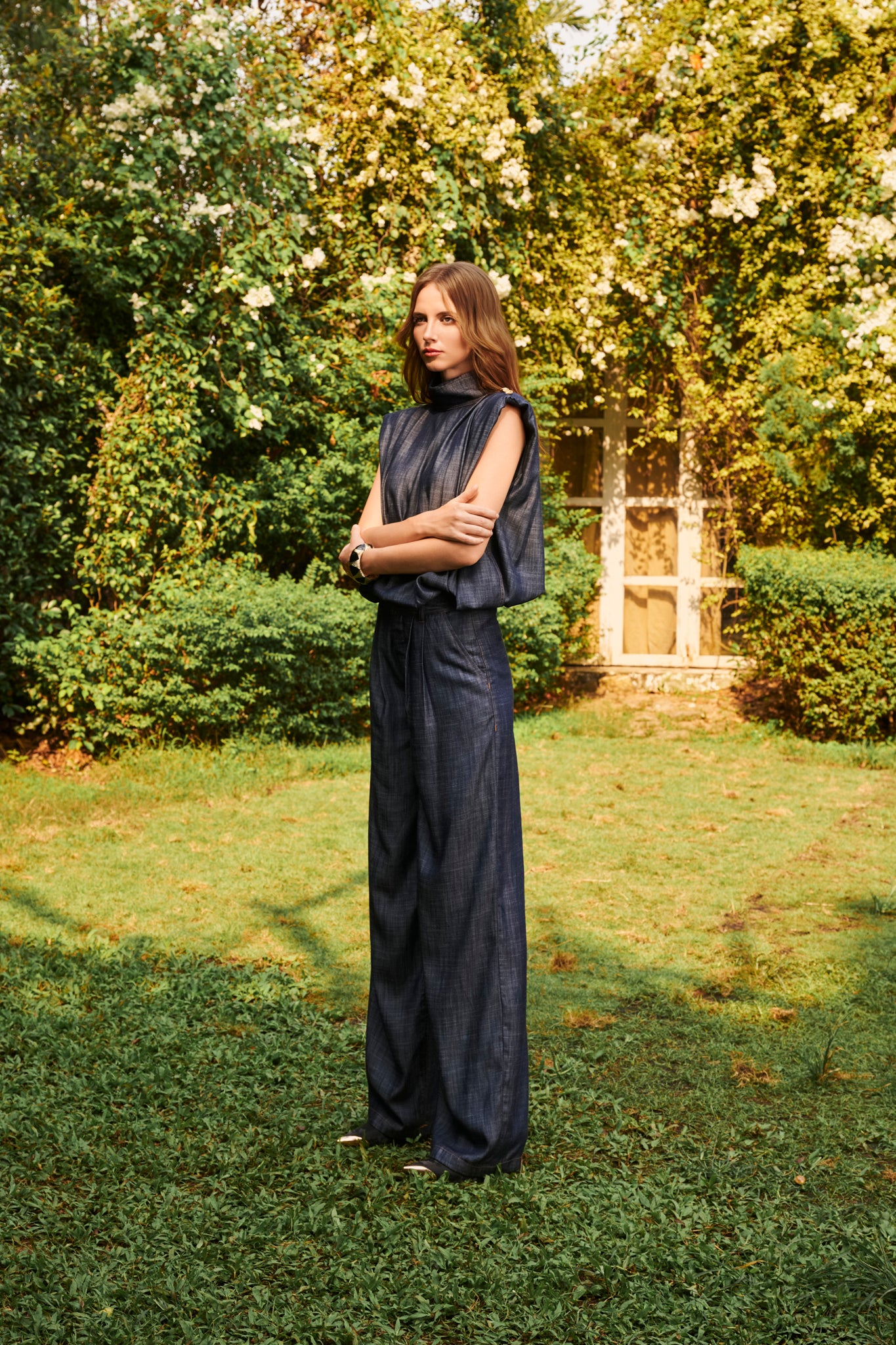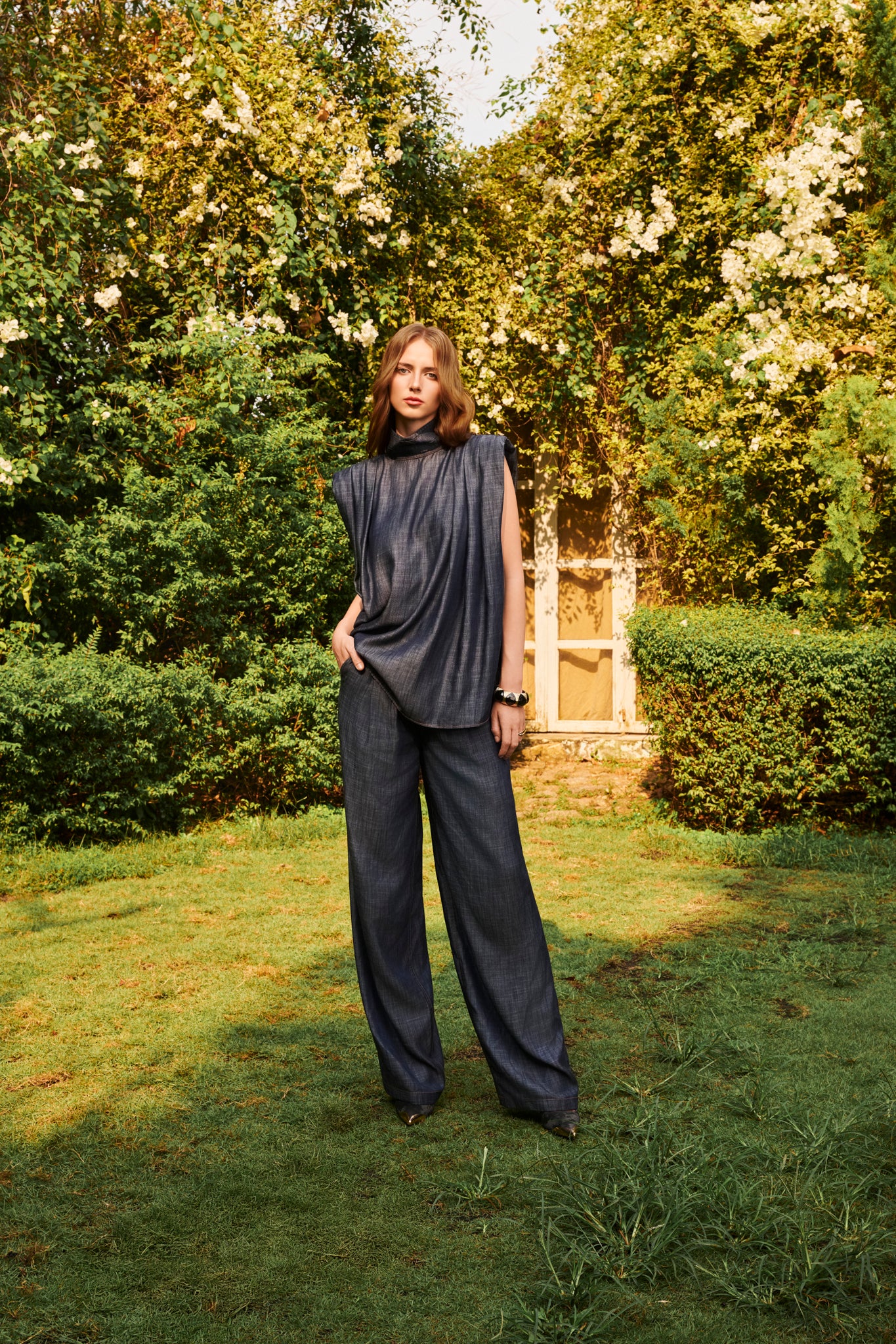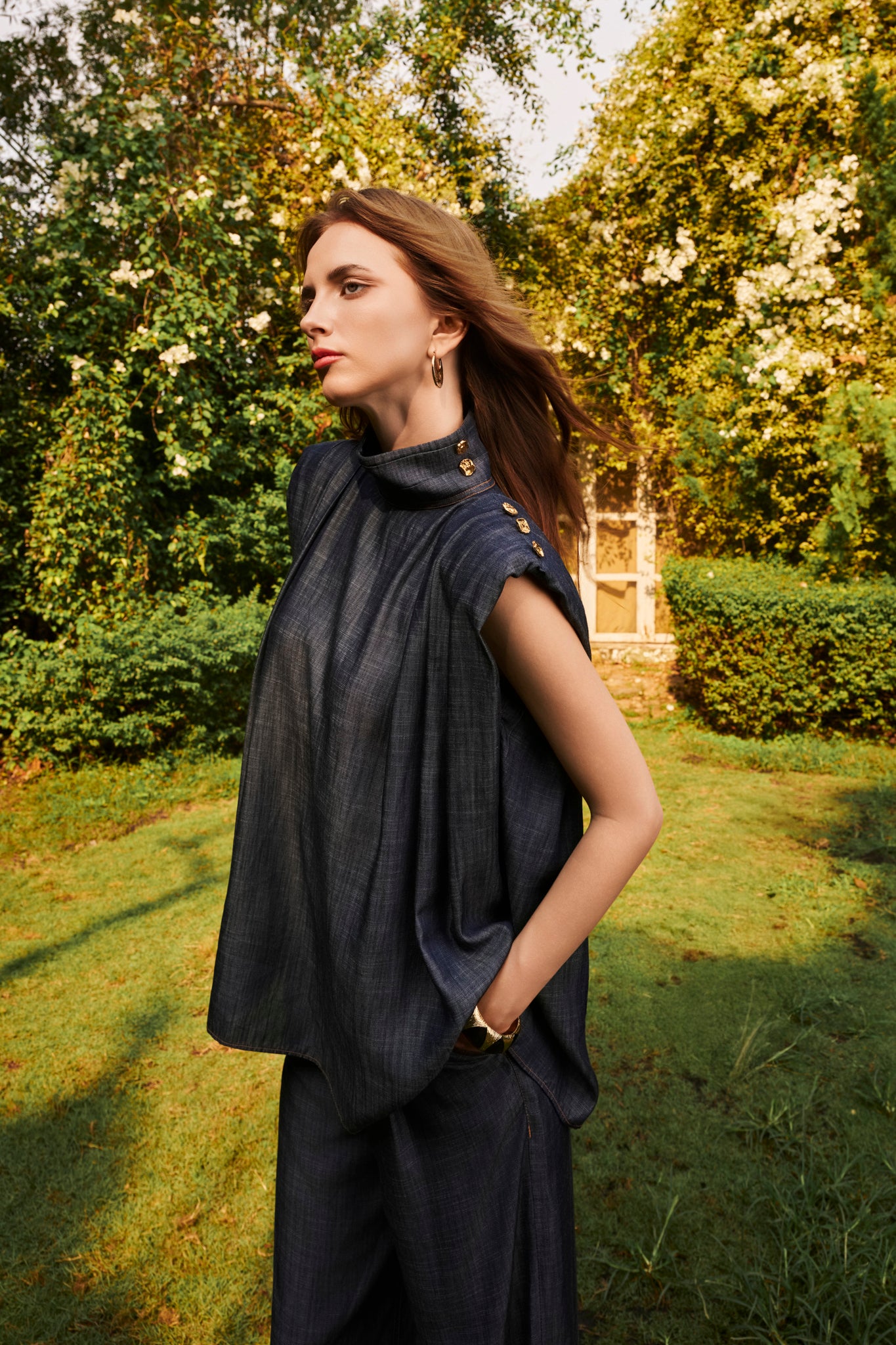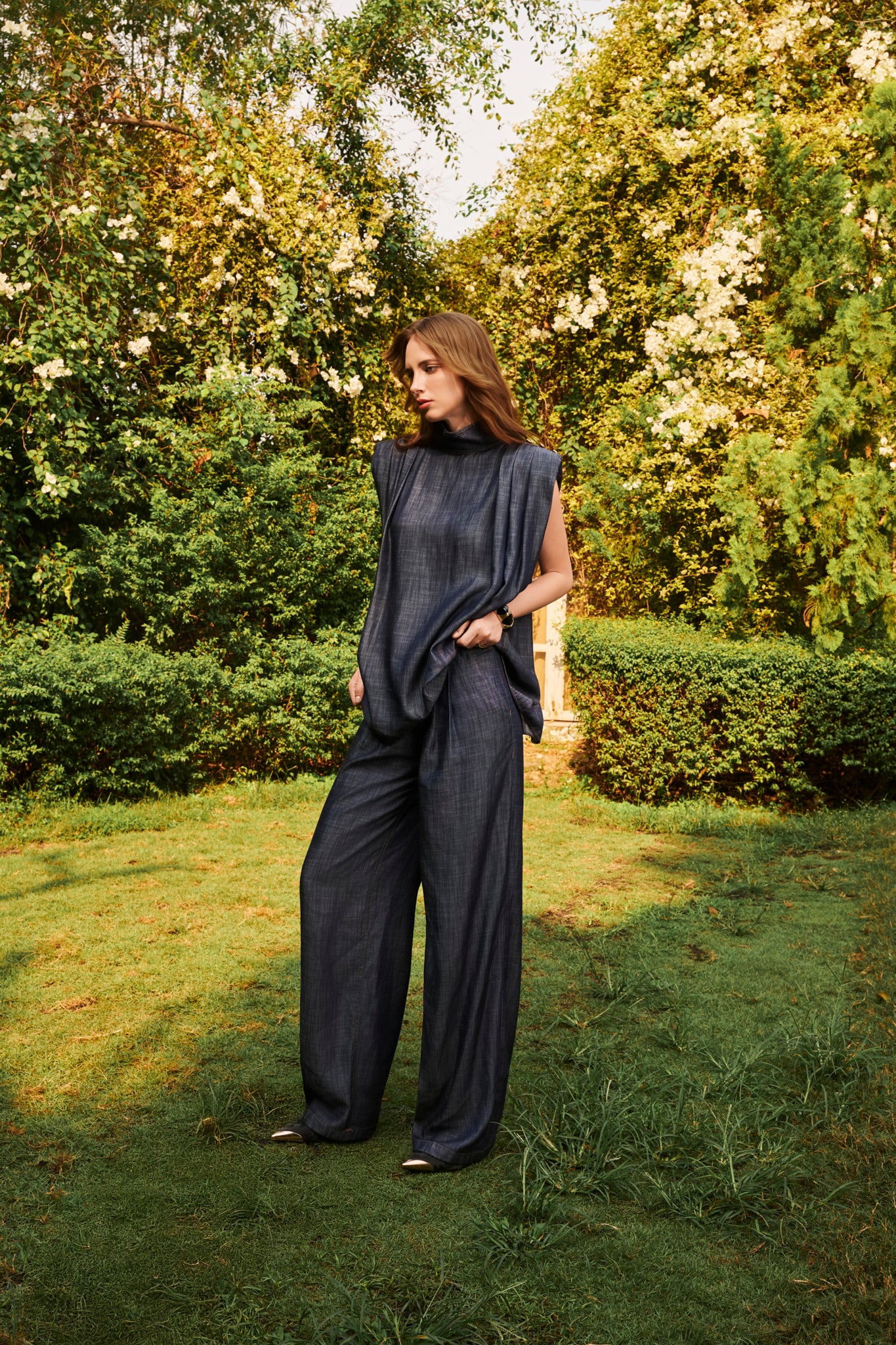 The Kiro Co ord is crafted from soft, Light-weight Silk blend denim with precise box pleats, combining tailored elegance with relaxed ease. Functional side pockets and a structured waist band with wide tabs add practicality, while light weight of the fabric offer an all season wearability and polished finish. Wear as separates with a relaxed top or pair back as a denim-on-denim set, effortless look.