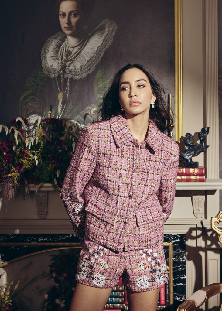 Preppy perfection. The Venetia co ord is crafted in textured wool silk tweed with tonal button details and a slightly boxy fit that hits right at the waist. Pairs perfectly with the matching shorts for a Blair-worthy twinset moment-but looks just as cute thrown over a white tee and jeans. The vibe? Winter florals, structure, and a little bit spoiled.